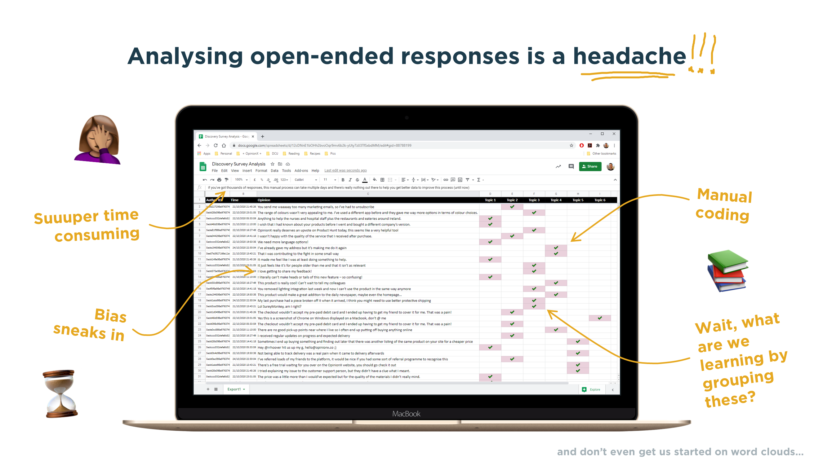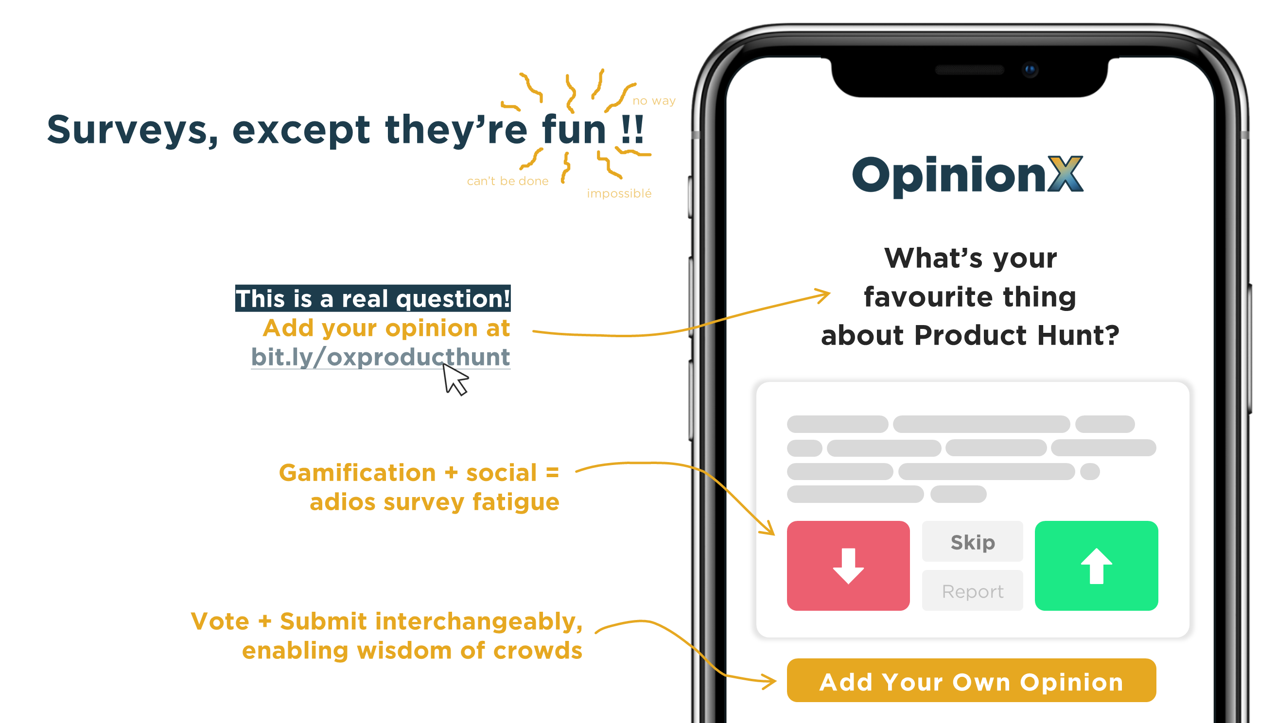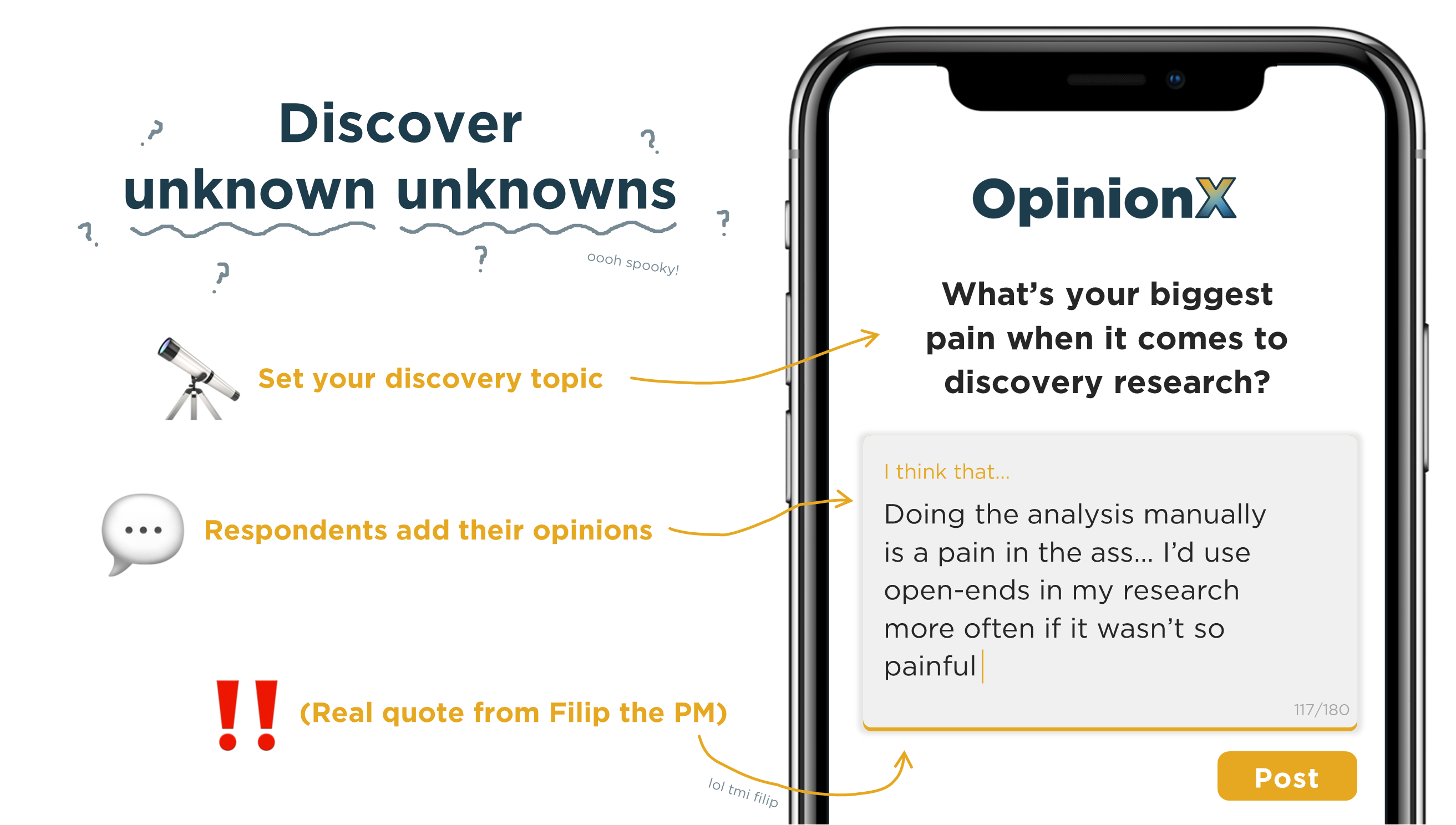 OpinionX makes discovery research easy! Ask open-ended questions and let OpinionX identify the opinions that are most important to respondents by letting them vote on other people’s statements. Next-generation survey that blends qual and quant methods