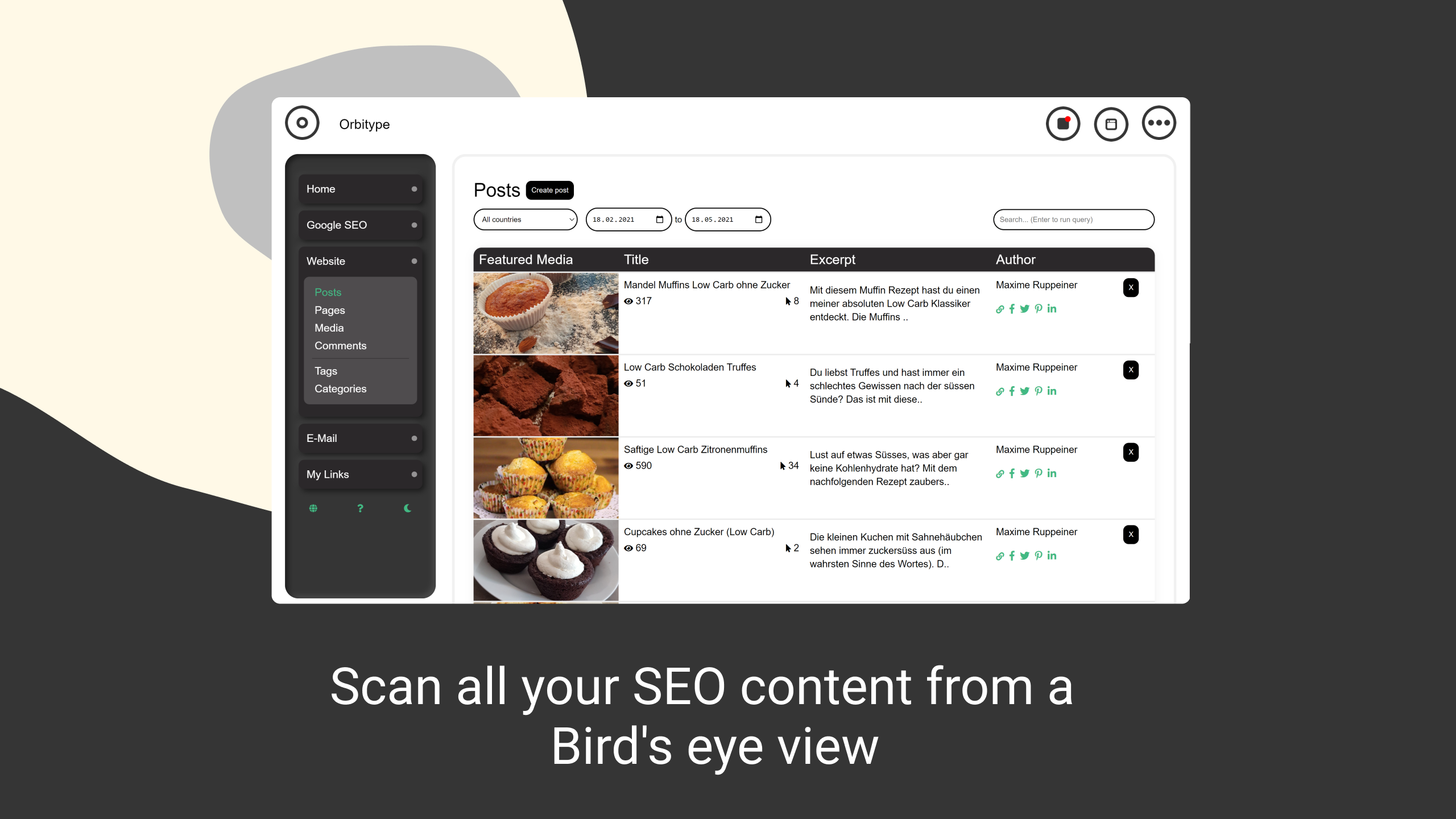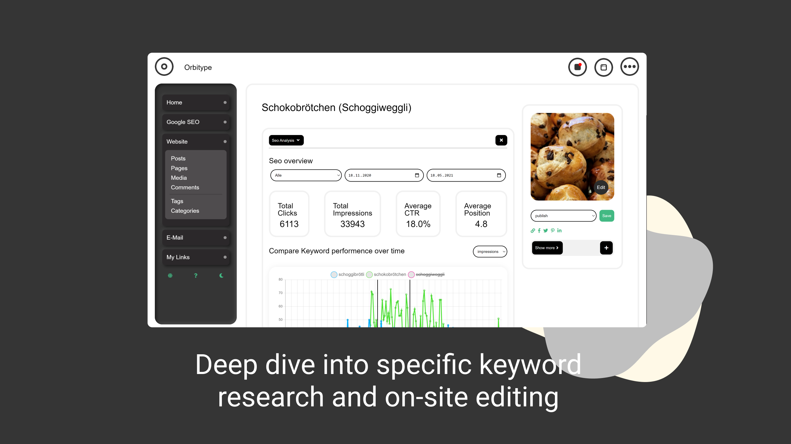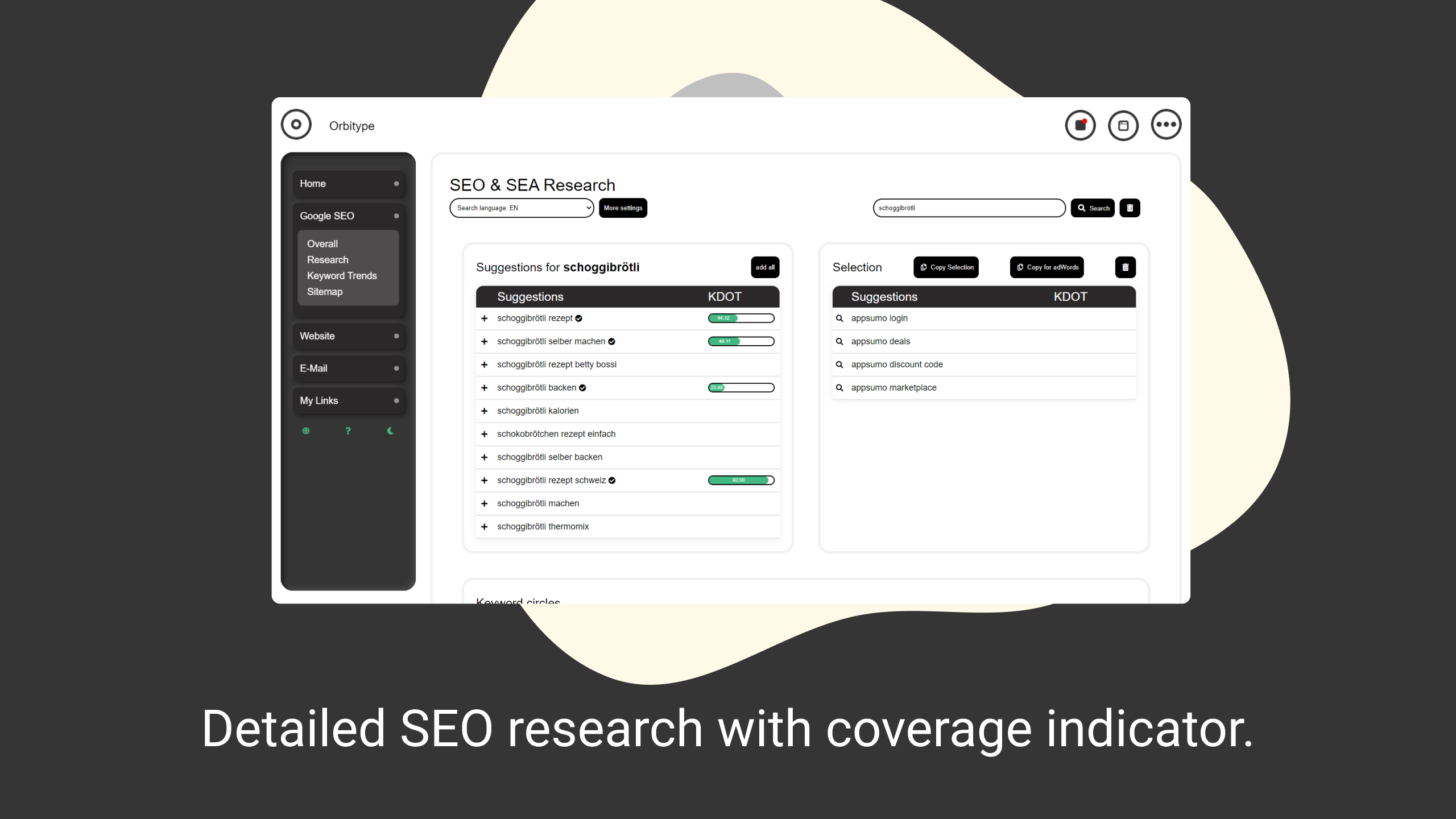 Orbitype is an external "Wp-Admin" for WordPress with focus on SEO and workflows for daily use. We combine WordPress (WP-API), SEO (Search Console), WooCommerce (Woo-API) and Email (Imap-Smtp) in a clean working environment for daily use. Some of our links: Giveaway: https://kingsumo.com/g/e5tole/win-50x-orbitype-pro -60 % AppSumo offer: https://appsumo.com/products/marketplace-orbitype-seo-workflow-focused-daily-business-backend/ Product hunt: https://www.producthunt.com/posts/orbitype-for-wordpress WP-Plugin: https://wordpress.org/plugins/orbitype/ Free account + 30D free Orbitype Pro trial on our website: https://orbitype.com/ Our Website: https://orbitype.com/ Finally, bring light into the darkness of SEO! Gain new customers through greater organic reach & work effectively with them. + Build organic reach quickly! This comprehensive SEO research tool helps you find new relevant keywords within seconds. From the easily created keyword lists, you can also easily create Google Ads target groups in seconds not hours. + External backend for WordPress! Orbitype connects to your existing WordPress, WooCommerce, or Google Search Console, as well as your email account. It bundles this data & gives you a solid decision-making basis for your business actions. + Keyword autocompletion! Easily understand how individual posts, pages, products & CPTs rank on Google & improve them with keyword autocompletion right in Orbitype. + Communication is key in business! We all communicate a lot with our customers. That's why Orbitype has an email tool built in which allows you to have a comprehensive overview of each customer without leaving the app. Visit our website for more information: https://orbitype.com/ - Analyzes and illustrates existing content. - Detailed SEO Research with coverage indicator. - Keyword autocompletion when editing in Orbitype. - Email correspondence are assigned to customers - Uses existing data and is ready for immediate use. - Simple and visually appealing writing environment - Drastically simplifies various workflows
