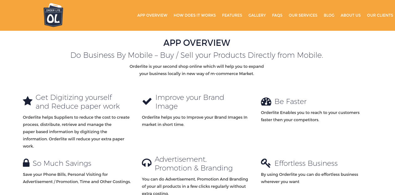 CREATE YOUR ONLINE SHOP IN A FEW CLICKS AND INCREASE YOUR BUSINESS PROSPECTS. Product uploading and sharing Upload your new products on Orderlite application easily on daily bases, share them with your customers and get Good prospects. Manage your customers You can manage your customers as per your convenience with complete privacy Categorized Product Classification Orderlite application has a Classification in which You can add Products as per the categories. Manage your Product You can add / change product's price, Product Information and other details anytime-anywhere.