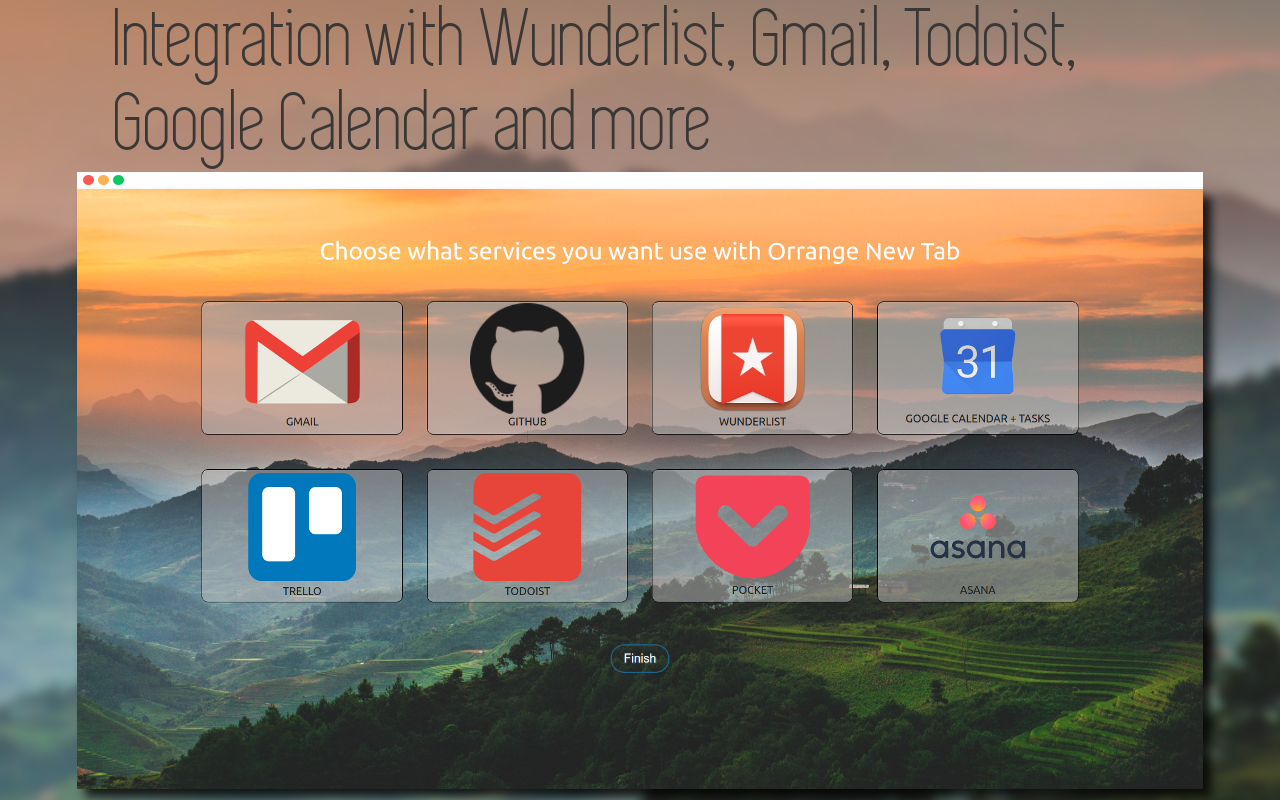 A new tab that lets you arrange your tasks and be more productive. •Boost your productivity with To-Do list and calendar available right from your new tab •Integration with Wunderlist, Todoist, Trello, Google Tasks, Asana and more •Manage your mail and calendar events with Gmail and Google Calendar integration •Customize your new tab with your favorite background image •Remind yourself of your saved articles with Pocket integration.