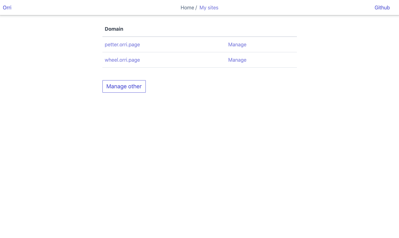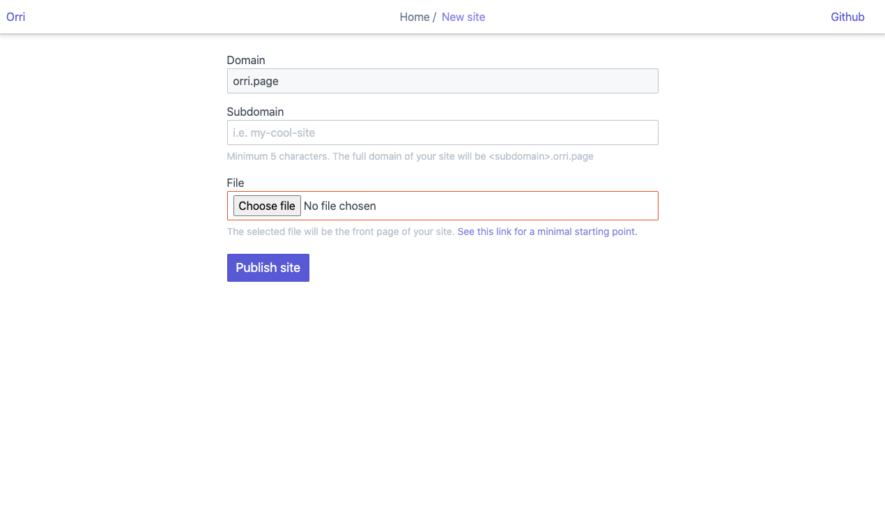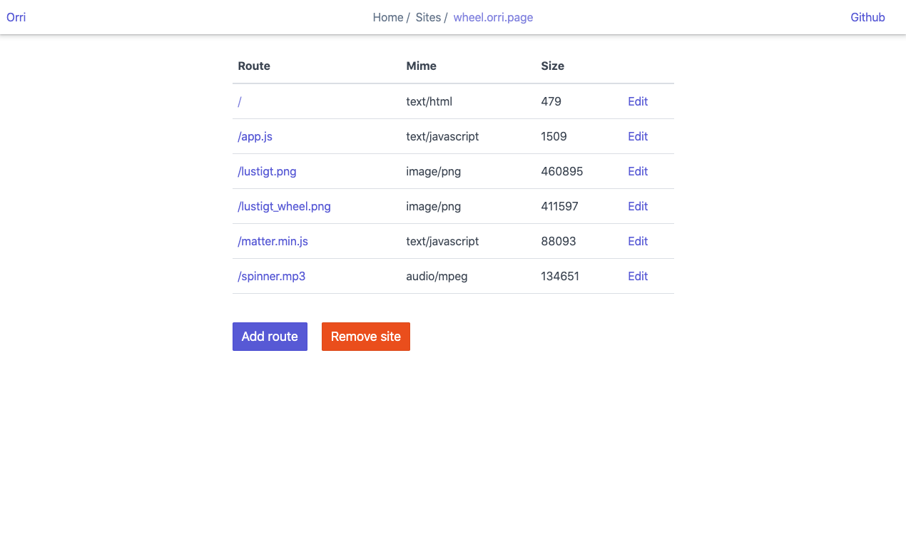 Orri is a web service for hosting websites. A user can create a site by choosing a subdomain, creating routes and uploading files that will be served at those routes.