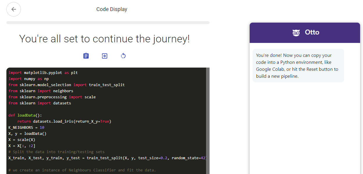 Otto is an open-source intelligent chat application and a WINNER of the Facebook AI Hackathon! The app makes machine learning an intuitive, natural language experience, helping aspiring ML engineers go from idea to implementation with minimal technical knowledge. ?? Highlights ?? - Beginner-friendly design Users simply describe their end goals to obtain recommendations, or choose from sample datasets to harness our models. - Powerful machine learning tools A range of ML capabilities are supported, including models for regression, classification, and natural language processing. Play with neural networks, explore data visualizations, and generate ready-made Python code right in your browser! Supports Scikit-learn, TensorFlow Keras, and WitAI libraries. - Educational experience Users are walked through each stage of the process, with Otto explaining terminology when needed. Annotated code blocks provide a high-level understanding of their end-to-end pipeline. ?? Discover Otto ?? - Explore our GitHub and Quick Start guide: https://github.com/KartikChugh/Otto - Talk to Otto! https://ottoml.online/ - Facebook announcement: https://developers.facebook.com/blog/post/2020/07/15/facebook-online-hackathons-latest-winners-announcement