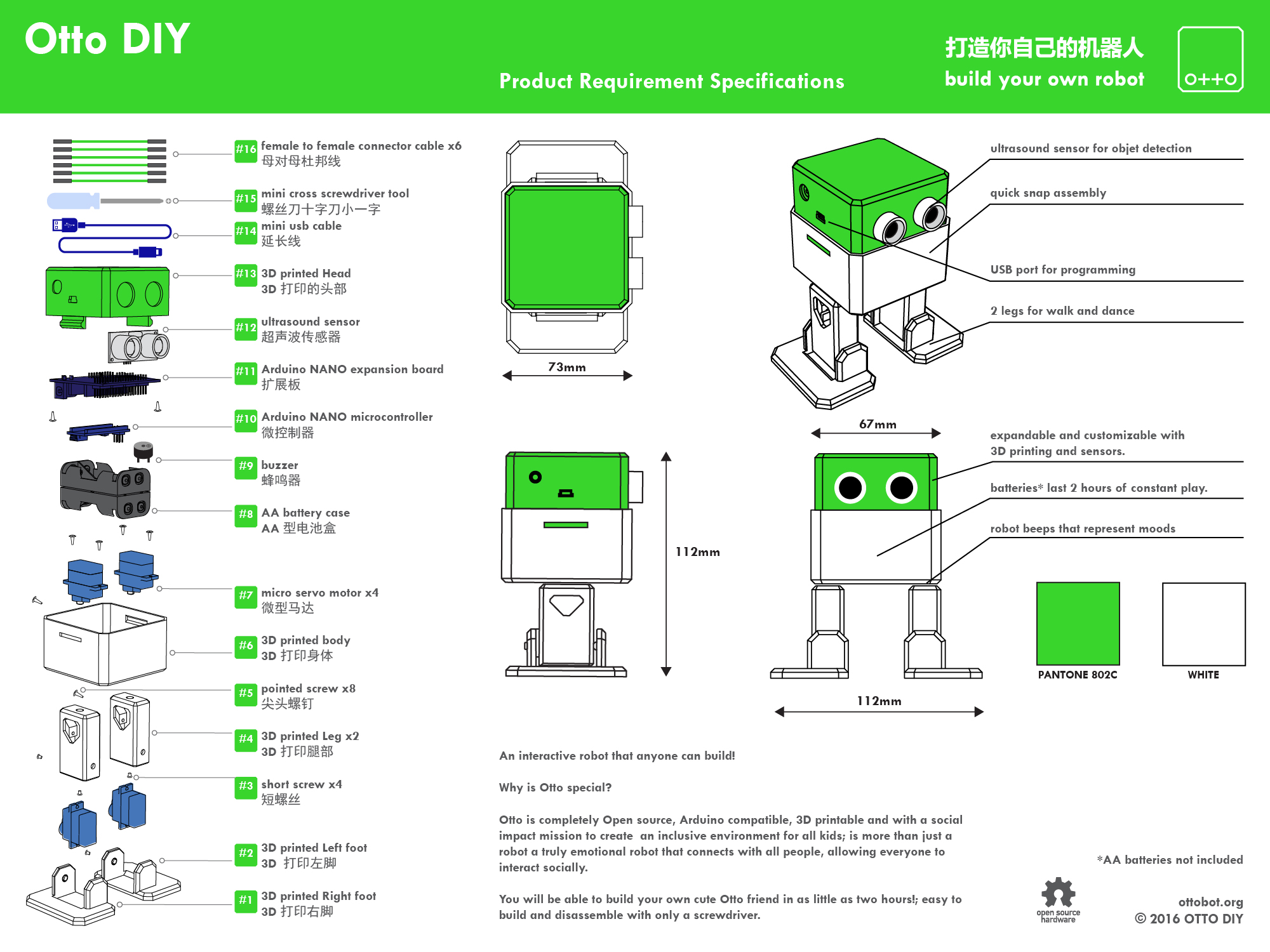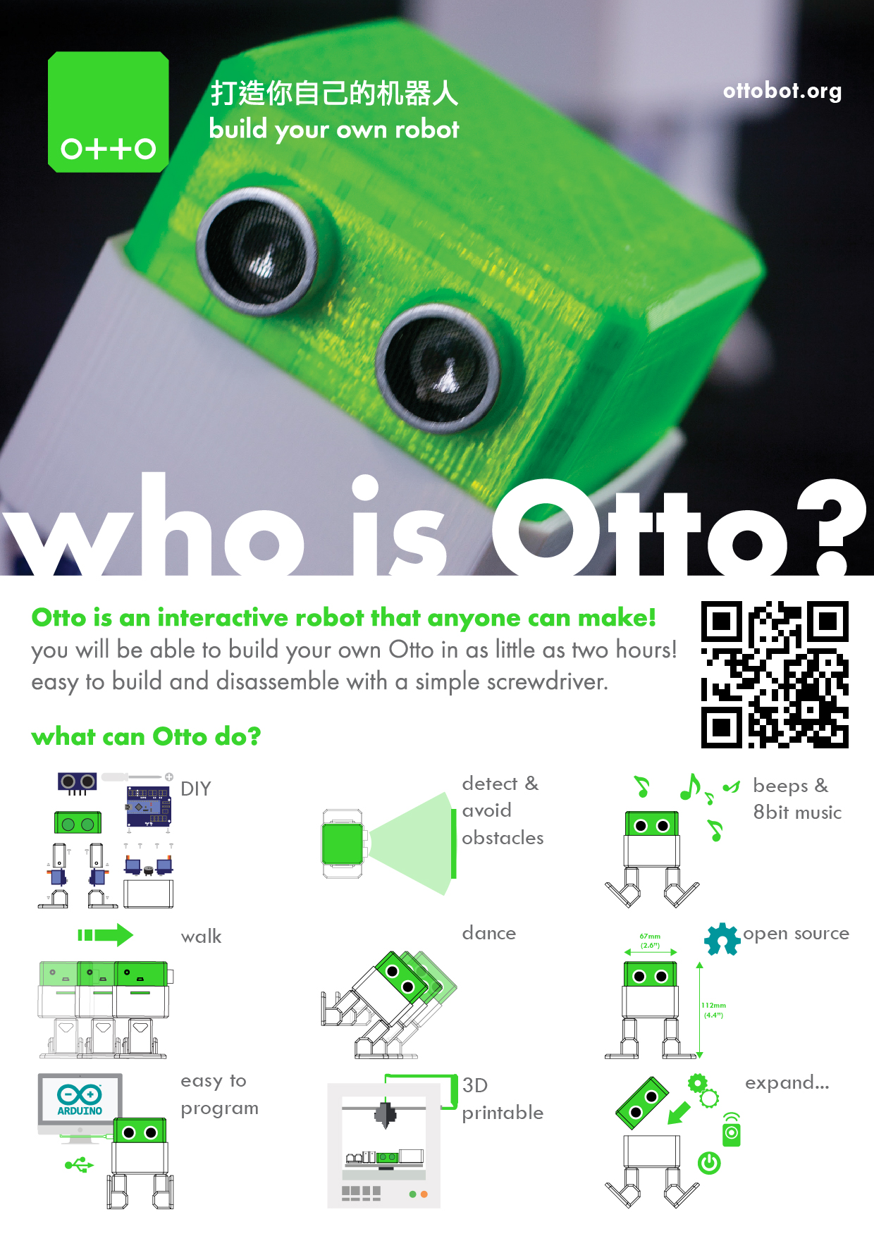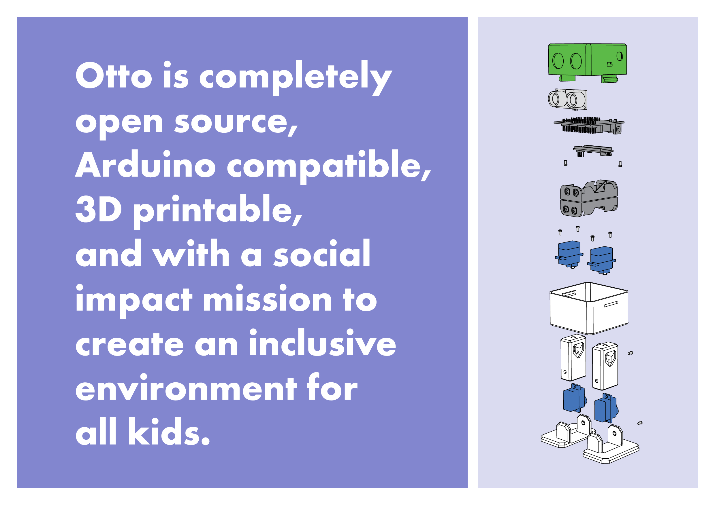 who is Otto? Otto is an interactive robot that anyone can make! why is Otto special? Otto is completely Open source, Arduino compatible, 3D printable and with a social impact mission to create an inclusive environment for all kids; is more than just a robot a truly emotional robot that connects with all people, allowing everyone to interact socially. "build your own robot" the act of building and coding your own Otto will create an emotional attachment between you and him that will become a long-lasting friendship.