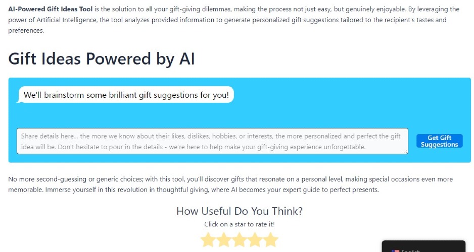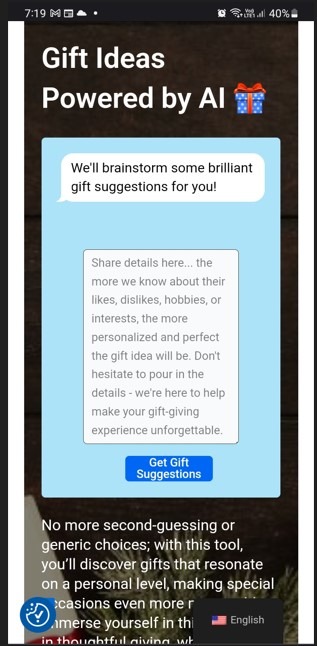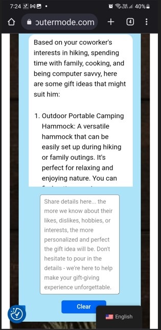 Hey there, meet Outermode, your gift genie! This fantastic tool uses AI magic to help you find the best gifts ever. It's like having a personal gift guru right at your fingertips. And guess what? It's super easy to use, and you don't need to sign up or pay a dime. Outermode's got your back! No more waiting forever for the page to load. Outermode is quicker than a caffeinated cheetah. Zip, zap, and boom - you'll have tons of personalized gift ideas in a flash. Oh, and did I mention that Outermode speaks both English and German? It's like a gift genie that knows its way around the world. So, whether you prefer "hello" or "hallo," we've got you covered. Now, gift-giving can be stressful, right? But Outermode takes all that stress away, leaving you as carefree as a beach bum on vacation. Just sit back, relax, and let the AI do the thinking for you. So, next time you're scratching your head for gift ideas, call upon Outermode, the AI-powered gift wizard. It's the best thing since sliced bread, and it won't even ask you to register or pay a single coin. Get ready to be the ultimate gift-giving hero! ππ