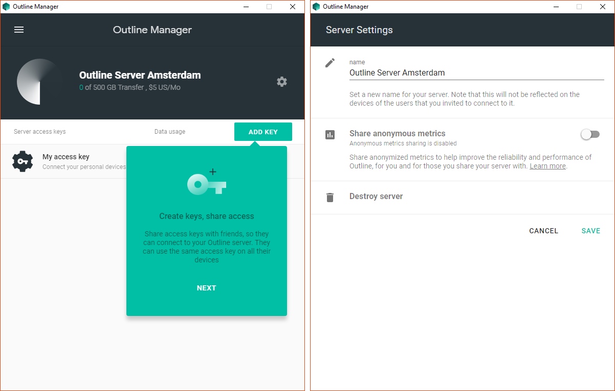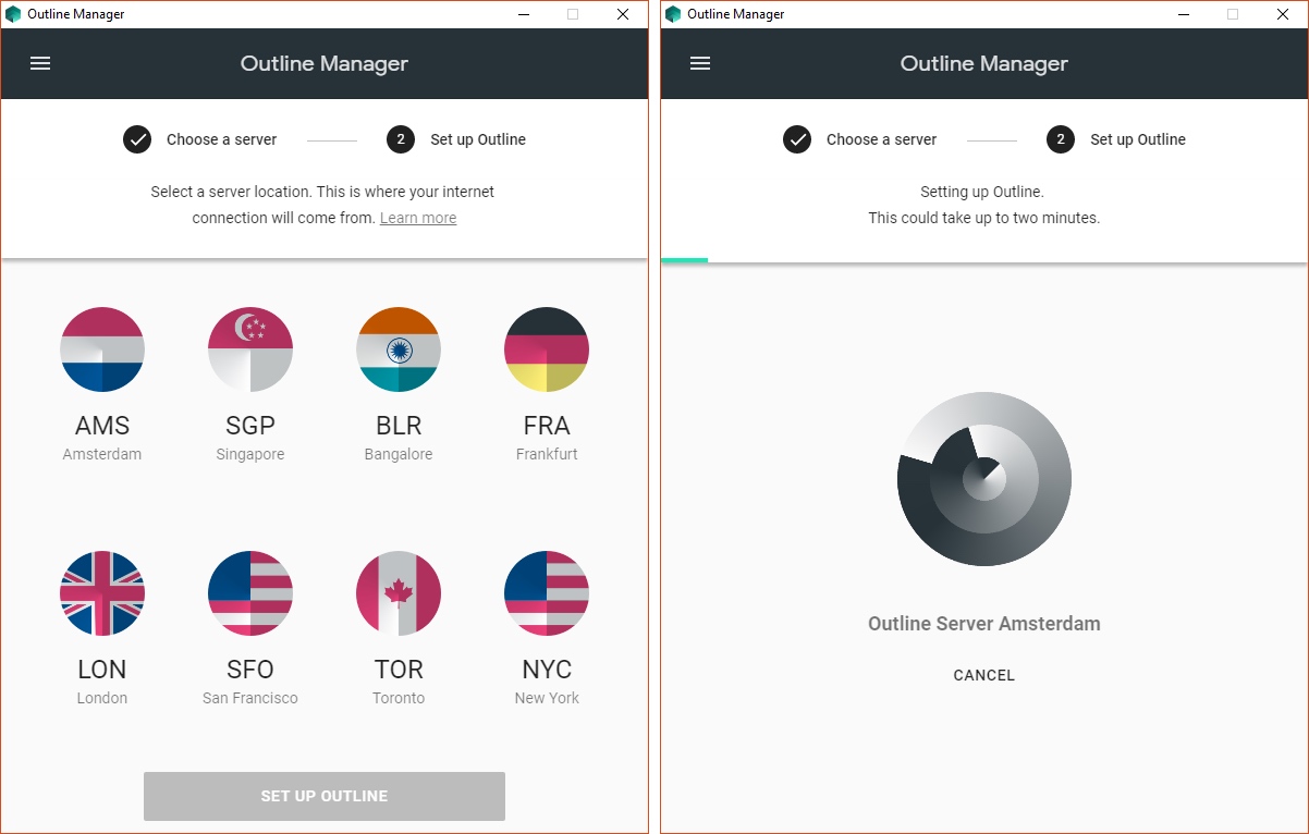 Journalists need safe access to information to research issues, communicate with sources, and report the news. Outline lets news organizations easily provide their network safer access to the open internet. Internet access you can trust Outline makes it easy for news organizations to set a up a corporate virtual private network (VPN) on their own server to more safely connect to the internet and keep their communication private. Strong privacy and security Outline gives you control over your privacy by letting you operate your own server and Outline never logs your web traffic. Strong encryption helps keep your communications private. Built for news organizations Outline is easy to set up and manage. Organizations can set up their own server in just a few minutes—no tech savvy required.