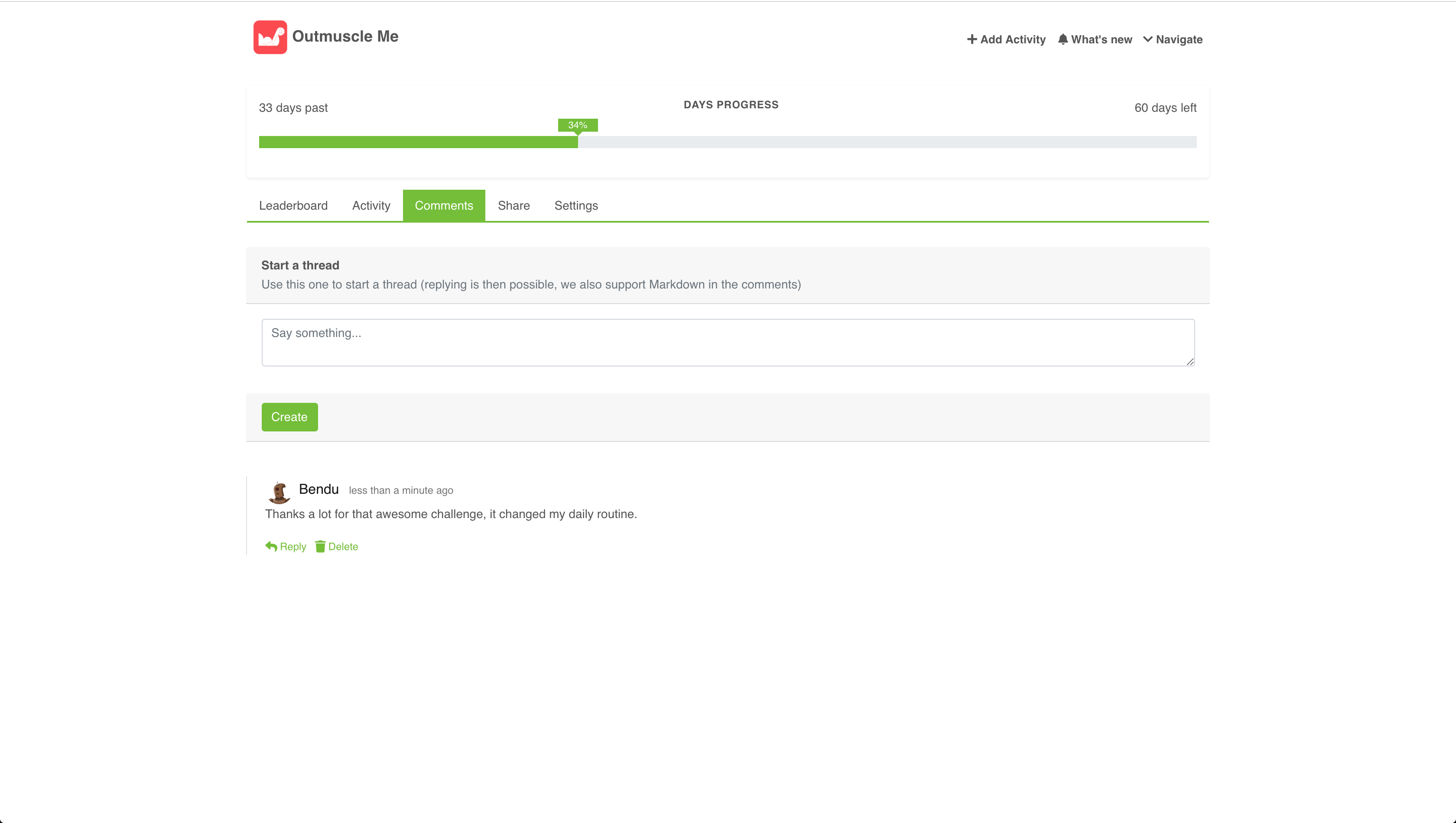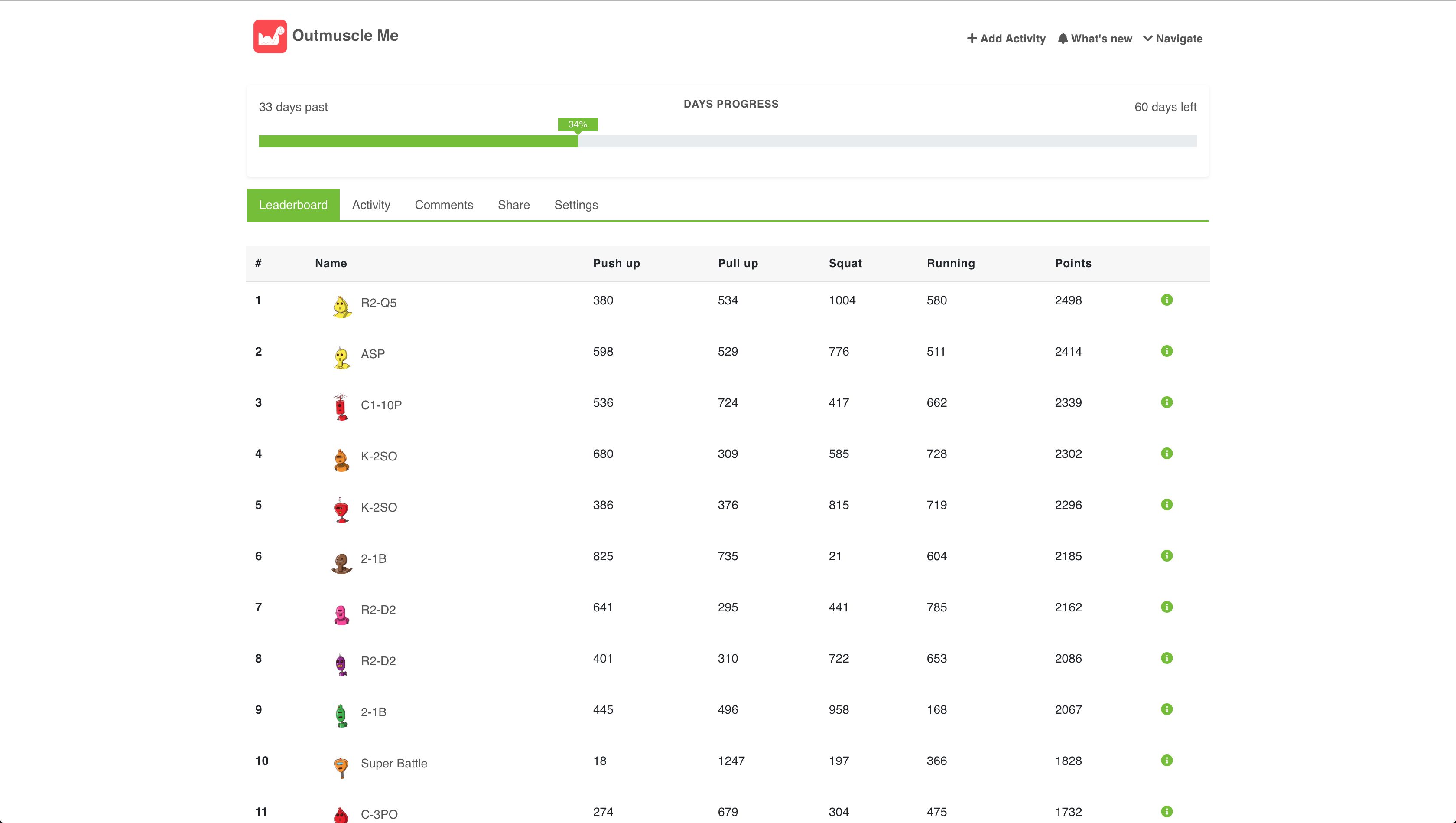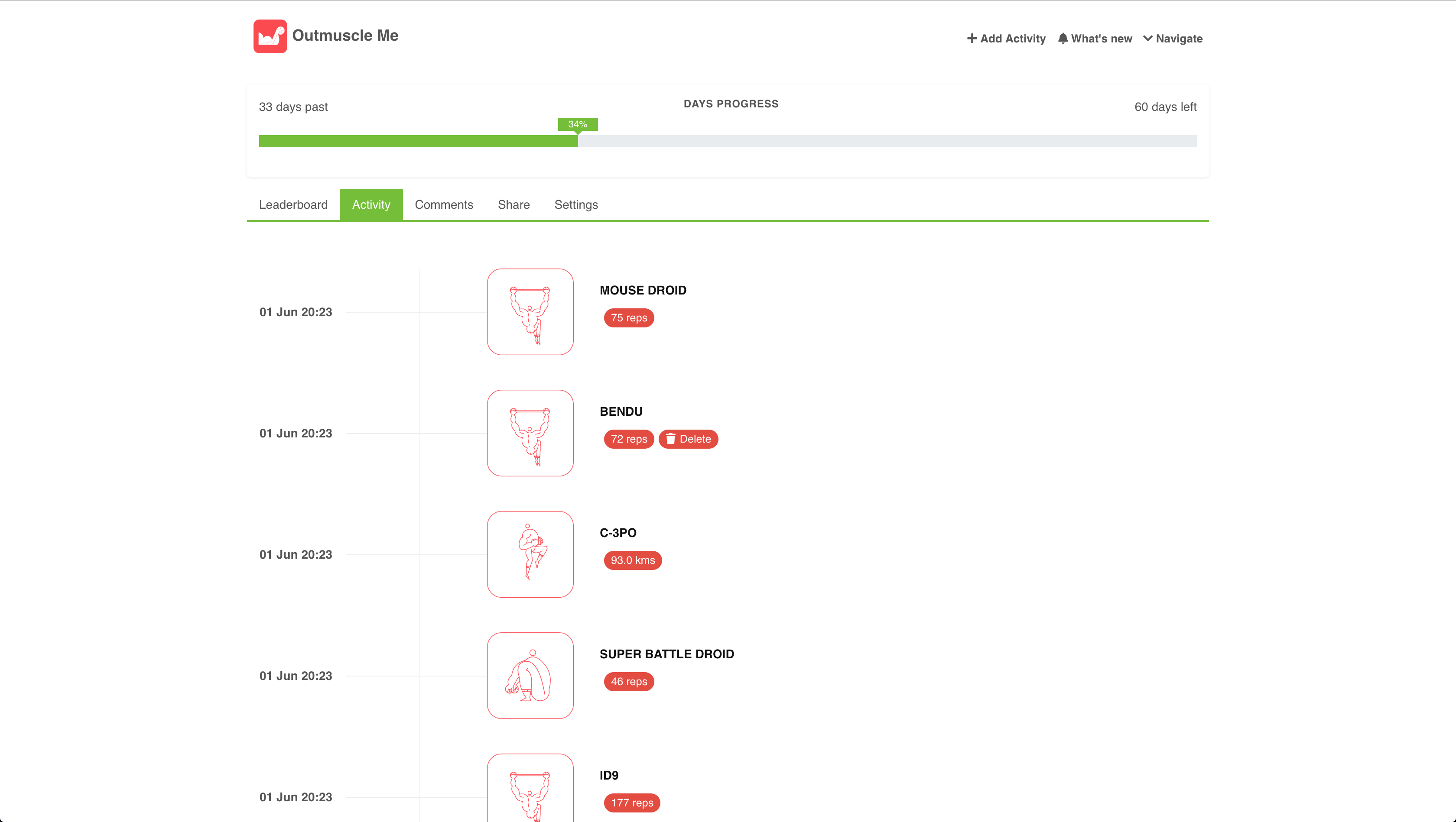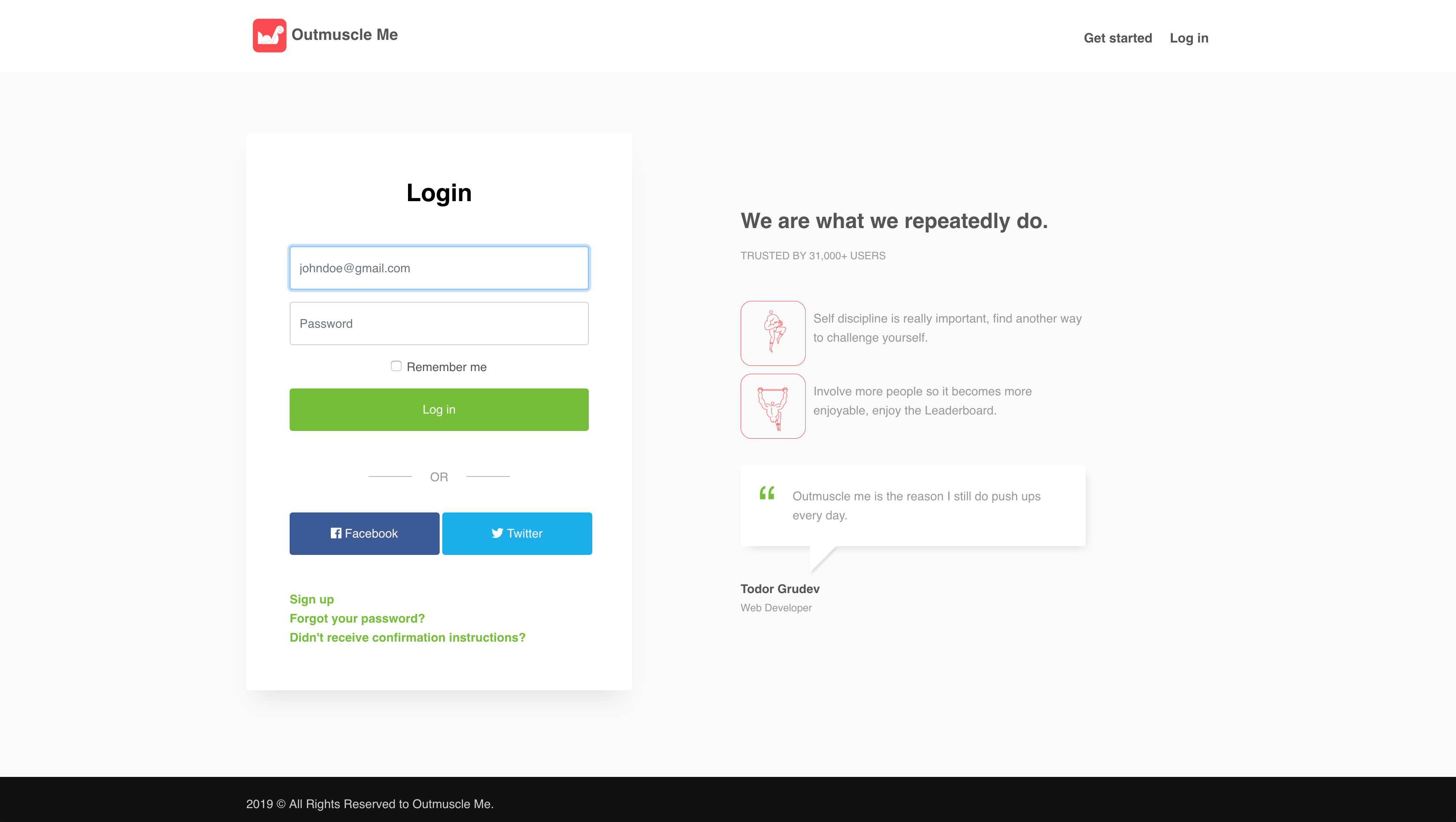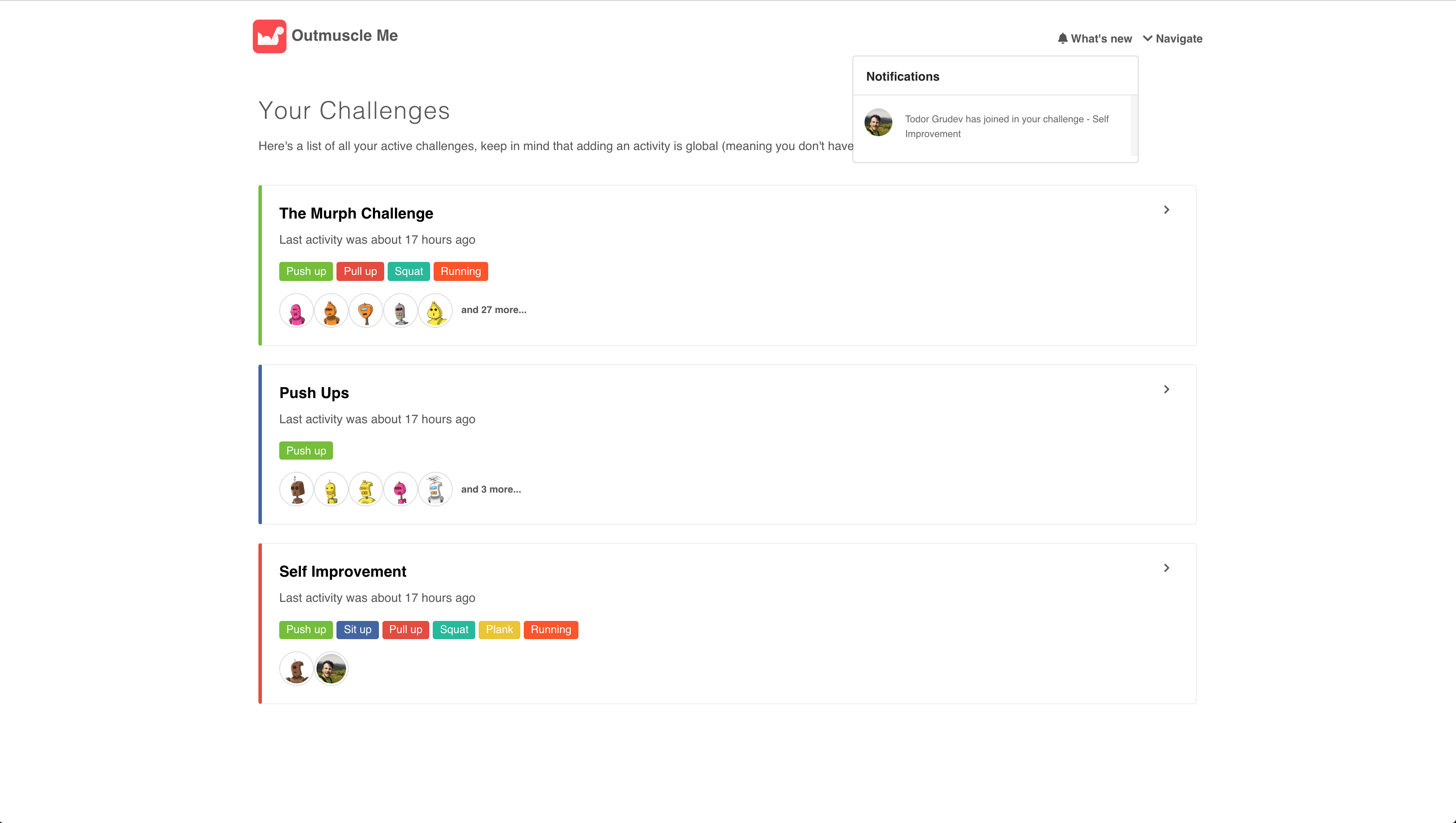 Finding the motivation to keep doing physical exercises is hard, involving friends and competing with them makes it fun and this is what Outmuscle Me is all about. Now it's not uncommon to see a person doing push ups in the office :) The creation of this platform came from a challenge between co-workers which kind of grew on it's own into something bigger. Currently we support 6 types of exercises and each of our users can create challenges - choose a start and an end date and invite people by sharing a simple URL.
