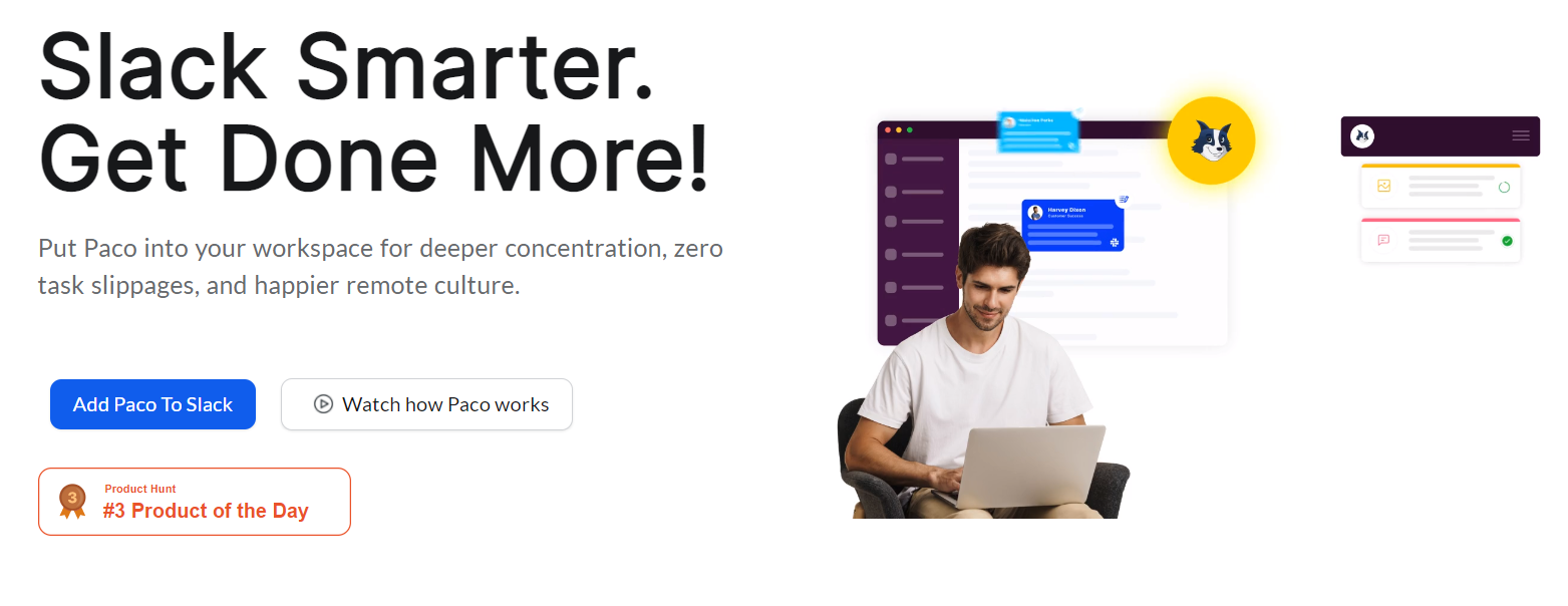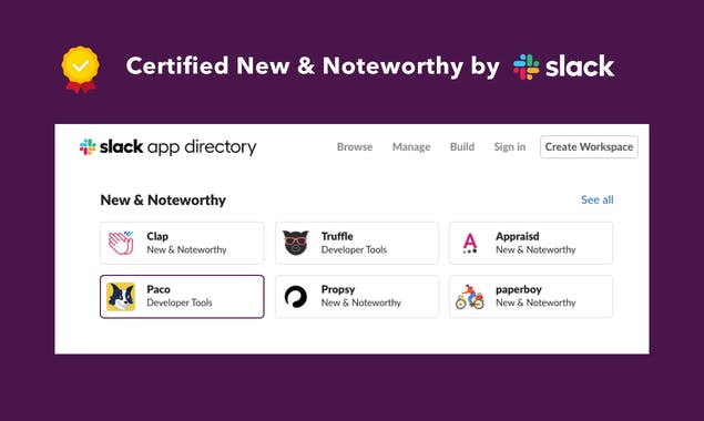 Add Paco to your Slack for deeper concentration, zero task slippages and happier remote culture. https://pacohq.com/ Paco is a new Slack app that sniffs out important asks hidden beneath heaps of Slack conversations and reminds you about them at an appropriate time. It follows up with your colleagues automatically, freeing you up to tackle things that need your undivided attention. Supercharge your Slack productivity with Paco. Perfect for Developers, Designers, Data Scientists, Managers, Product Managers, Founders/CEOs or WFH remote workers who need to step away from the Slack chaos and still not miss out on important stuff. Paco was recently the #3 Product of the Day on ProductHunt, and is featured as a 'New & Noteworthy' app on Slack.