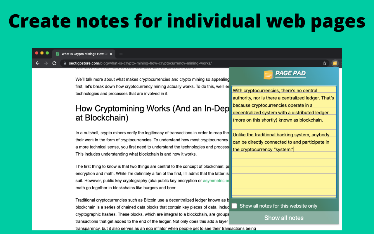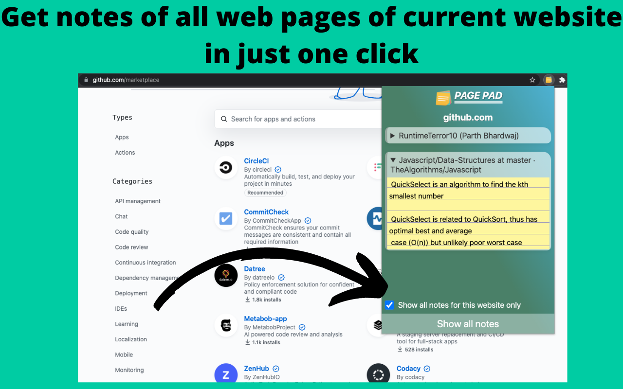 Hey, Product Hunt community! I'm excited to share my first ever Chrome extension called "Page Pad". This is the first-ever product I have created! Page Pad is a productivity tool for creating notes on any web page you visit. It allows you to edit and organize notes for a particular web page and also notifies if the user has already created notes for the current web page. Re-visit any web page where notes were created and all your notes will be present as it is from where it was left off! FEATURES: - Create notes for individual web pages. - Refer to notes of all web pages of a website at once! - Fully editable notes - Autosave feature - Works offline - Keyboard accessible UPCOMING FEATURES: - Rich text editor with formatting and image support - Voice-based notes (Speech to text) - Quick note addition Really looking forward to any feedback or questions!