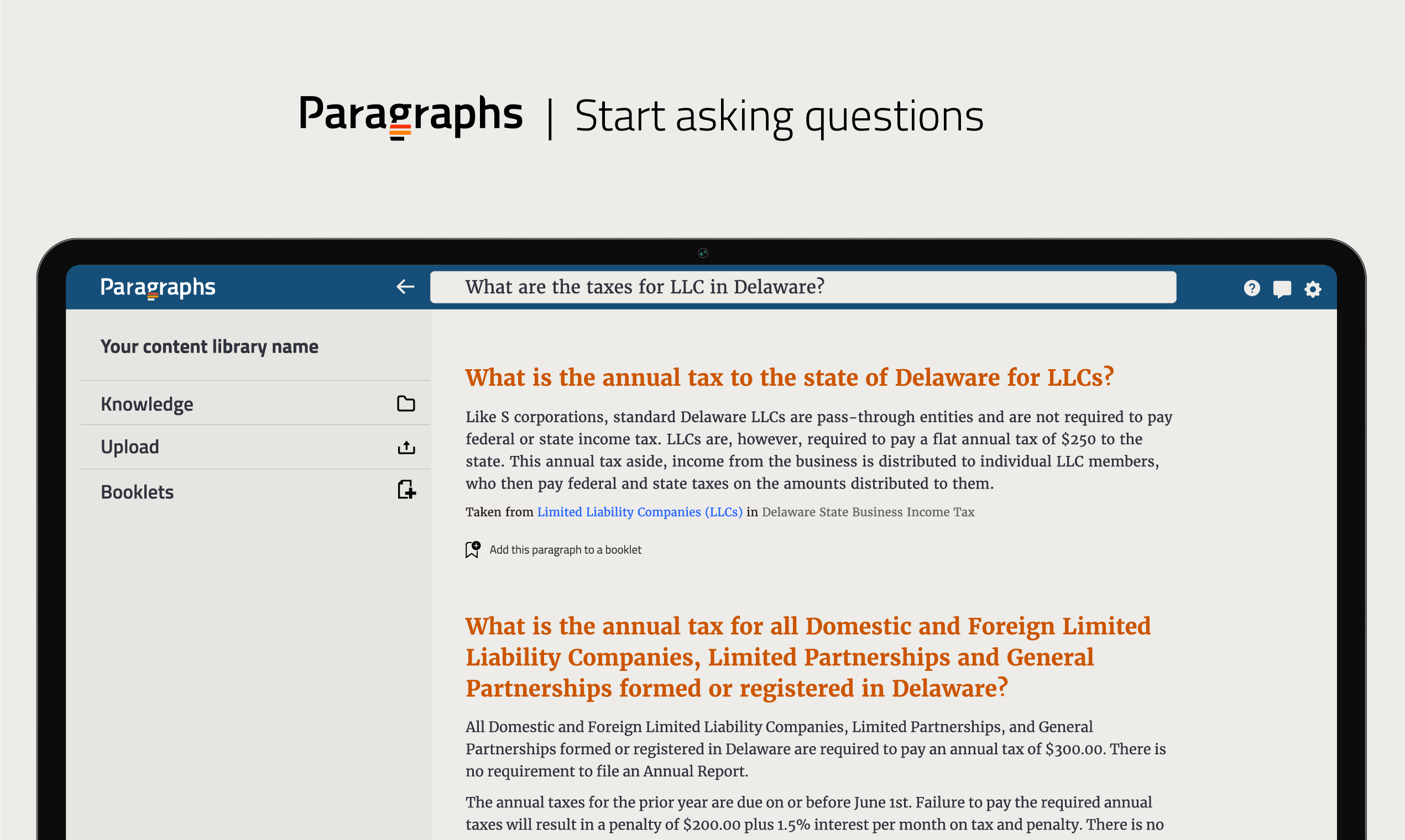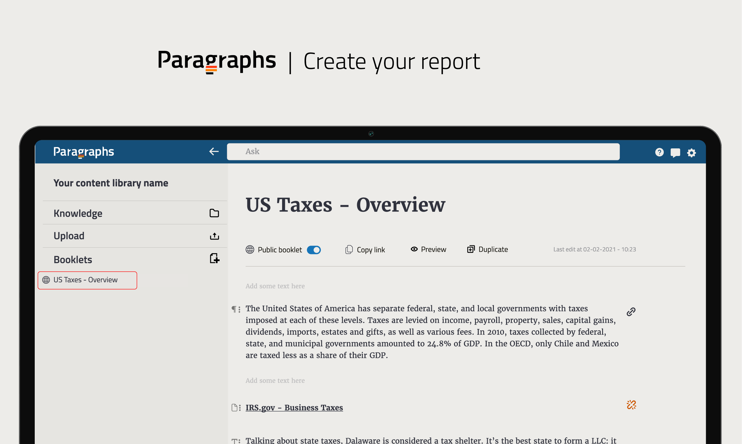 Paragraphs helps you find information inside your knowledgebase and use it to create new documents. With Paragraphs you can create a report while searching, in 3 steps: 1. Upload your knowledge base on Paragraphs, ask a question, and retrieve the precise snippet of text containing the information you are looking for. 2. Gather the paragraphs with all the answers you need into a booklet, while the reference sources will be automatically tracked. You will be notified when the original files are deleted or changed. 3. Organize the selected paragraphs and add your personal touch with extra text blocks to compile reports, note-taking, summaries, researches, guides and much more. A special promotion is reserved for the first 100 users that join Paragraphs (individual version): a free monthly subscription for future purchase of Paragraphs Team. This is a beta version and it’s important for us to hear your feedback and suggestions. You can reach our team in our discord channel (https://discord.com/invite/nc5MrE7JnE) or by email at [email protected]