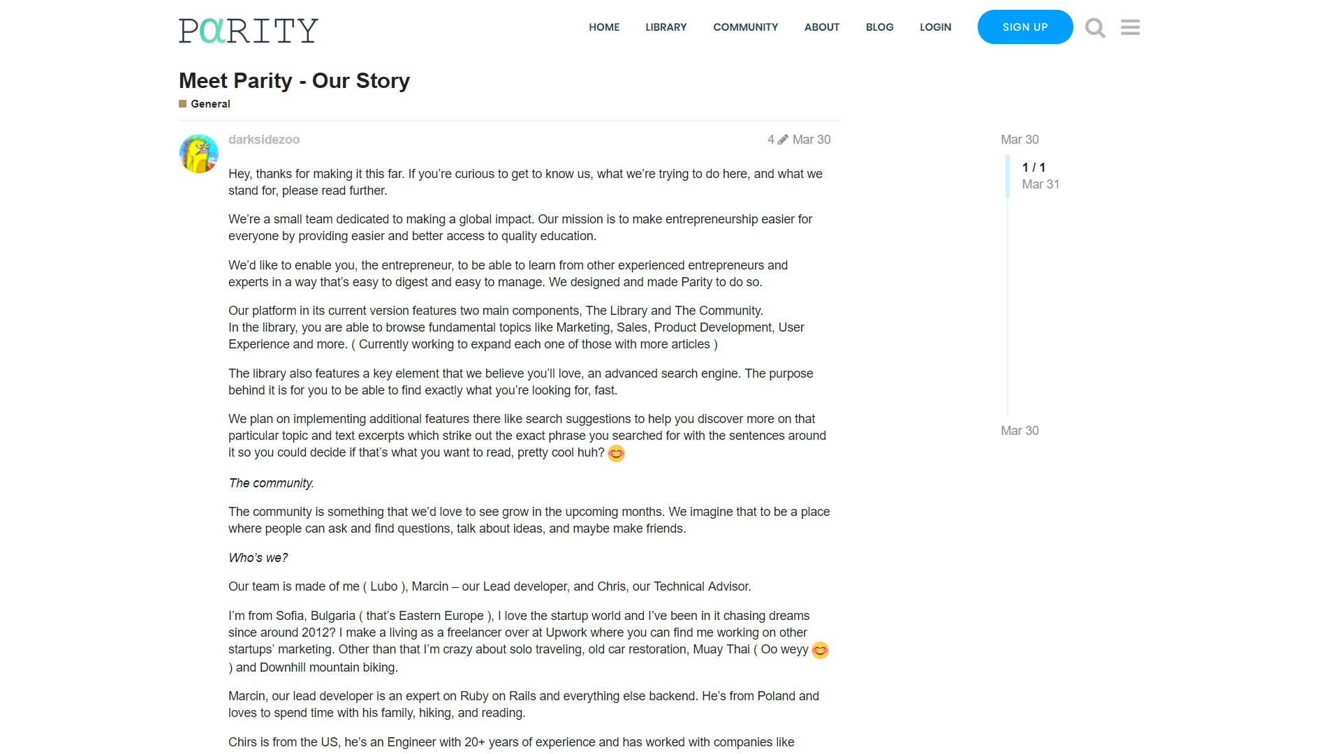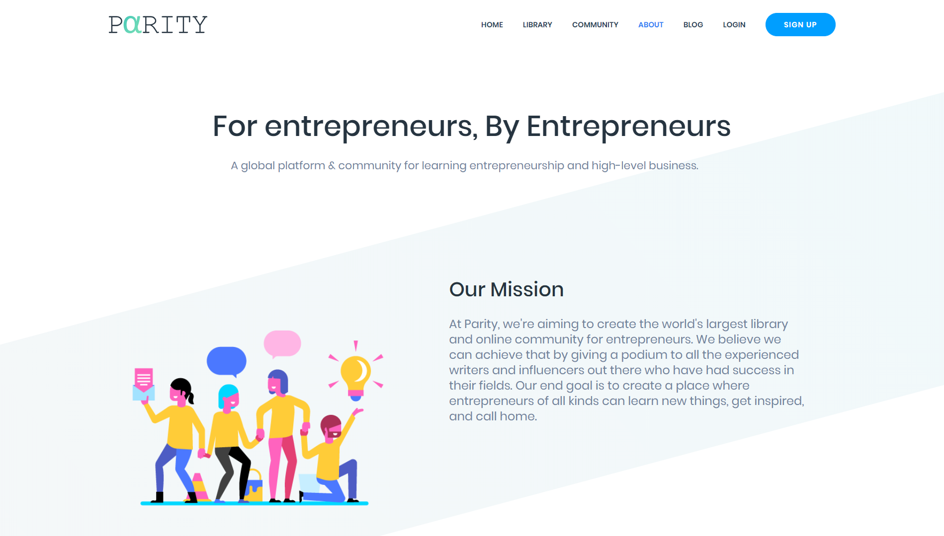 Hey, thanks for making it this far. If you’re curious to get to know us, what we’re trying to do here, and what we stand for, please read further. We’re a small team dedicated to making a global impact. Our mission is to make entrepreneurship easier for everyone by providing easier and better access to quality education. We’d like to enable you, the entrepreneur, to be able to learn from other experienced entrepreneurs and experts in a way that’s easy to digest and easy to manage. We designed and made Parity to do so. Since our full story is too long for BetaPage, you can read it here -https://community.parrity.com/t/meet-parity-our-story/18 In case you love what we’re doing here and you’d like to help us change the world of entrepreneurship, • Write in our library. • Register and engage in our community by asking questions and showing us your startup or work. • Recommending your favorite influencers and authors.