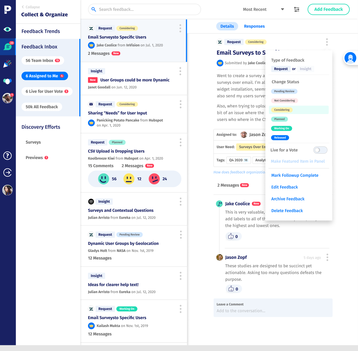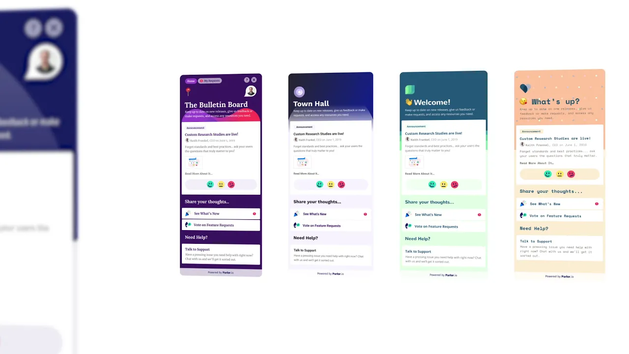 Parlor.io is a Feedback Management System designed to organize all feedback into a single system of record, quantify the highest impact needs, and automatically close the loop with your users. We do this in three ways: 1. Collect & Organize Feedback: Aggregate feedback from any source – product, support, or sales – into a single system of record to catalogue critical feedback trends. Popular features: • Customizable in-moment surveys • In-product feature requests & bug reports • Live chat, Slack, and support ticketing integrations 2. Prioritize & Validate Feedback: Identify the most pervasive and impactful user needs, prioritized by request volume, revenue, and customer sentiment. Popular features: • User voting on requests • Salesforce and JIRA integrations • Merge similar feedback to clearly quantify impact. 3. Communicate & Educate your users: Parlor closes the loop by automatically communicating progress and improvements back to users as their individual needs are addressed. Popular features: • In-app release notes • Dynamically segmented user cohorts • Automatic status updates on user requests Plus, Parlor connects directly to the tools that matter, including live chat, ticketing systems, CRMs, JIRA, and Slack. So, all important customer information can be used to measure the impact of collected feedback, which allows your Product and Customer teams to prioritize their work.