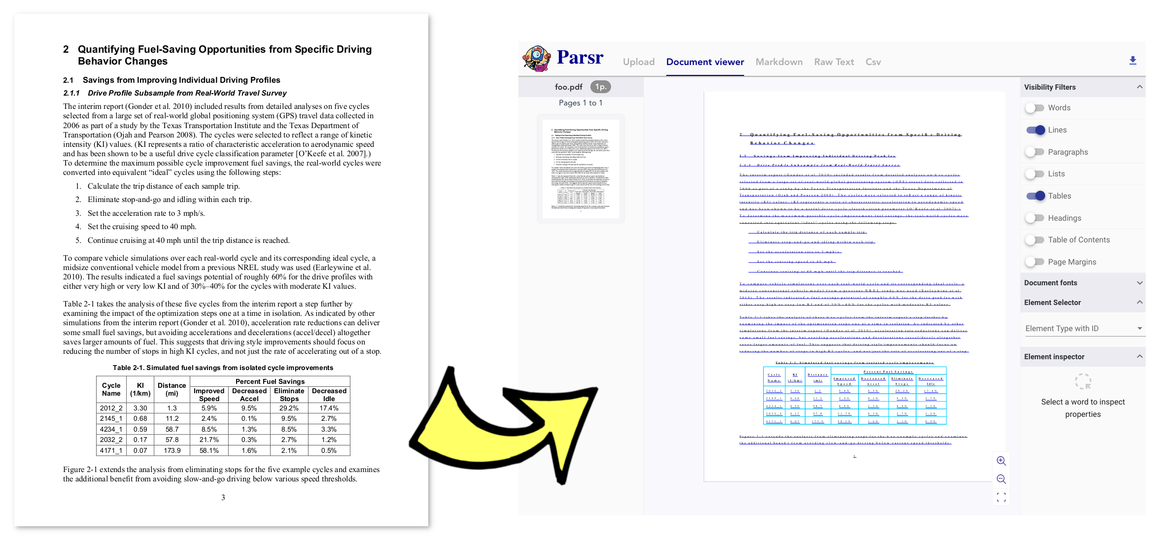 Parsr, is a minimal-footprint document (image, pdf) cleaning, parsing and extraction toolchain which generates readily available, organized and usable data for data scientists and developers. It provides users with clean structured and label-enriched information set for ready-to-use applications ranging from data entry and document analysis automation, archival, and many others. Currently, Parsr can perform: Document Hierarchy Regeneration - Words, Lines and Paragraphs Headings Detection Table Detection and Reconstruction Lists Detection Text Order Detection Table of Contents Detection Named Entity Recognition (Dates, Percentages, etc) Key-Value Pair Detection (for the extraction of specific form-based entries) Page Number Detection Header-Footer Detection Link Detection Whitespace Removal Parsr takes as input an image (.JPG, .PNG, .TIFF, ...) or a PDF generates the following output formats: JSON Markdown Text CSV (for tables), or Pandas Dataframes (see here) PDF