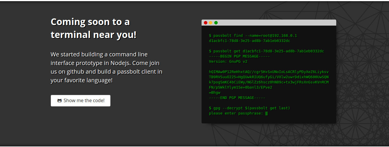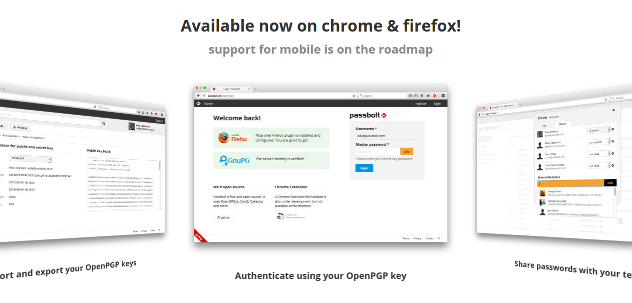 The password manager your team was waiting for. Free, open source, extensible, based on OpenPGP. Available now on chrome & firefox,support for mobile is on the roadmap. Soon will be available for command line interface prototype in Nodejs. Join 'Passbolt' on github and build a passbolt client in your favorite language. Passbolt Advantages : - Built for teams - Open source & free - Embrace open security standards - Top of the line tooling - Extensible by design - Methodically tested Discover passbolt API. Go through the Github profile of Passbolt.