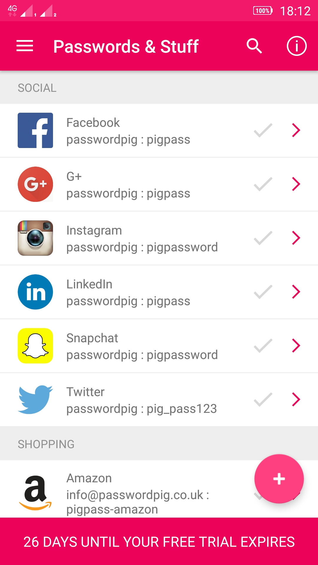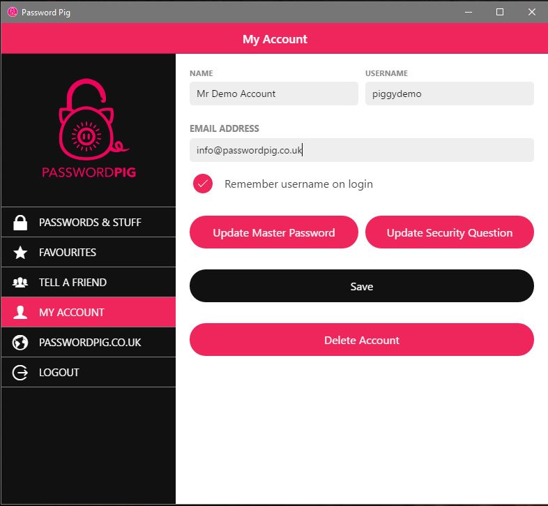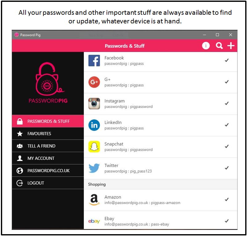 A different kind of Password Manager, Password Pig allows users to store, retrieve and update passwords and other important data on one or more devices, all for one low price* (after a 30 day try-it-free period). Never forget your important stuff again! It’s like a piggy bank for passwords, login details, bank accounts, credit cards and all your other secret stuff! Password Pig synchronises your secret stuff across ALL your devices so it’s always at hand. We developed Password Pig because we could not find a Password Manager that did what we wanted. We found other Password Managers too complicated or expensive. Password Pig is simple, secure, works across 6 device types and is flexible. Why not try the full app on all devices free for thirty days. Latest low pricing details are always on the website.
