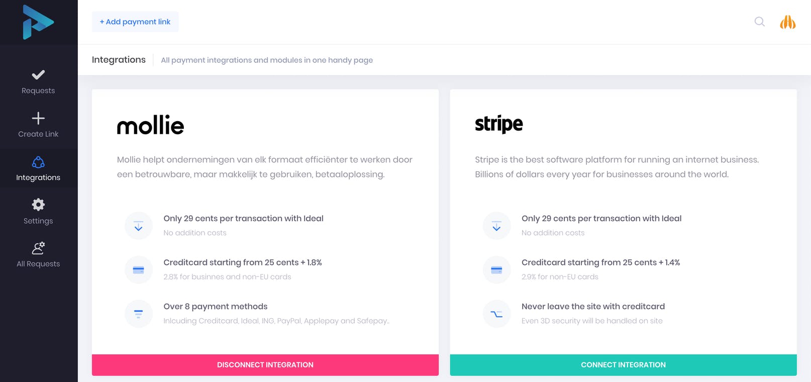 PayRequests lets you easily create payment links and share them via email, push-notifications or sms, we support all payment methods directly via your current payment provider.