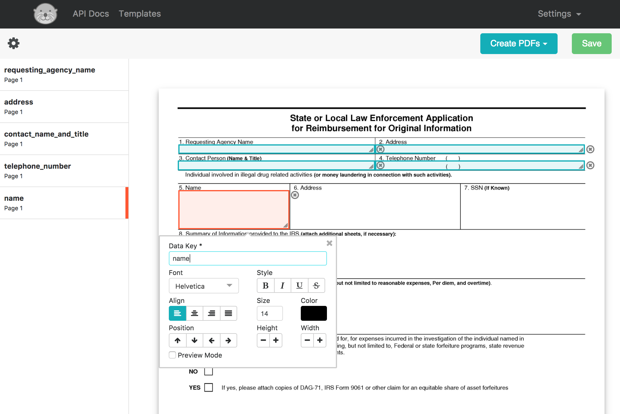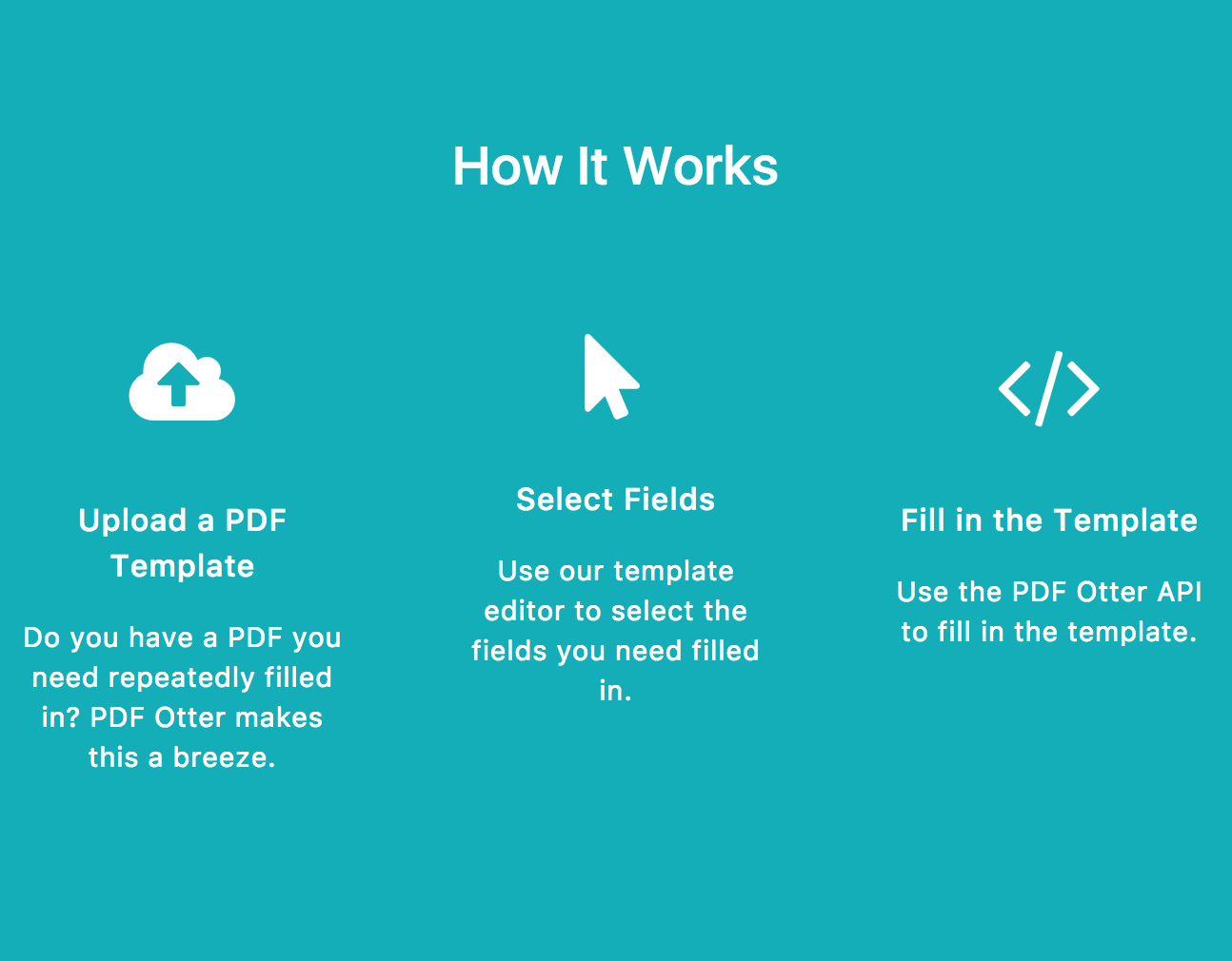 PDF Otter is an API for filling in PDF templates. PDF templates are any PDFs you want to draw text on. You can use the API to fill in PDF forms for your users or accept eSignatures on your app.