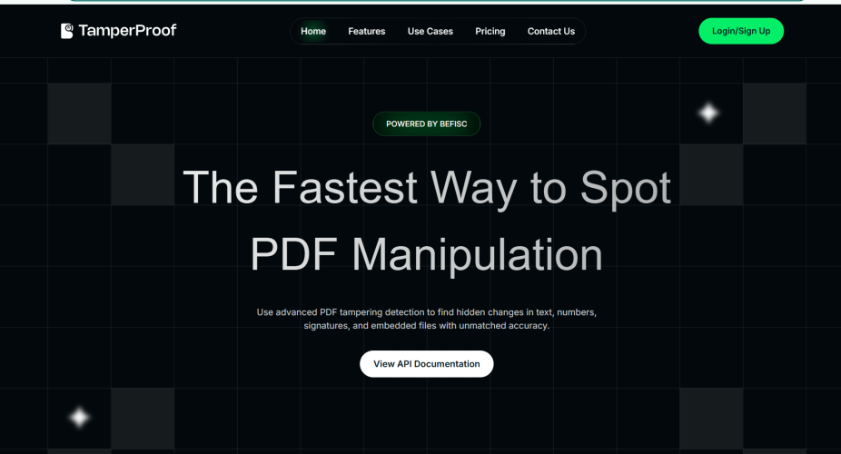 TamperProof is a PDF integrity and document tampering detection platform built to help businesses verify the authenticity of digital documents before they are trusted or acted upon. In many workflows—hiring, lending, insurance, compliance, and audits—PDFs are treated as final and reliable. In reality, PDFs can be edited, overwritten, or manipulated without leaving obvious visual traces. TamperProof solves this gap by analyzing documents at a structural and metadata level rather than relying on surface-level checks. TamperProof scans PDFs for hidden edits, overwritten text, replaced pages, metadata inconsistencies, and suspicious modification patterns. It identifies whether a document has been altered, what kind of changes were made, when they occurred, and which tools or editors were used. This allows teams to detect fraud, prevent forged submissions, and reduce manual verification effort. The platform also validates digital signatures, checks embedded files, and flags mismatches between visible content and underlying document structure. Results are presented in a clear, actionable format, making it easy for non-technical teams to understand document risk without deep forensic expertise. TamperProof is designed for HR teams, lenders, insurers, compliance teams, and organizations that handle high volumes of sensitive documents. It works as a web-based SaaS solution and supports bulk document analysis for operational scale. By turning PDFs into verifiable, trustworthy inputs, TamperProof helps organizations make faster decisions with greater confidence—without relying on guesswork or manual checks.