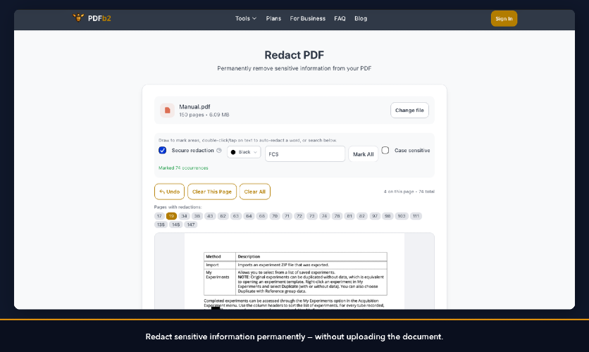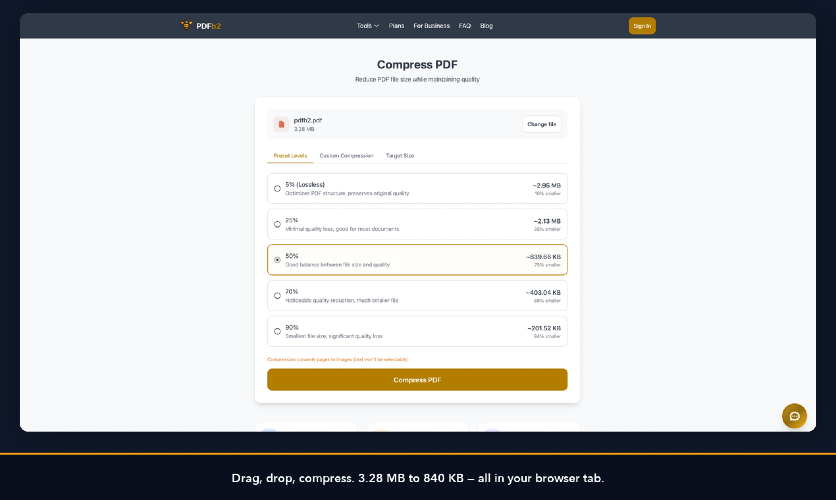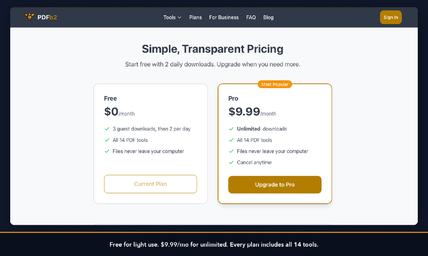 PDFb2 is 14 PDF tools that process everything in your browser using JavaScript. Files are never uploaded to any server. Compress, Merge, Split, Sign, Annotate, Watermark, Protect, Unlock, Redact, Fill Forms, Resize, Metadata editing, PDF to Image, and Image to PDF - all client-side. Built for legal, finance, and healthcare professionals who handle documents they can't afford to expose. Free tier: 3 downloads without sign-up, then 2/day with a free account. Pro: $9.99/month unlimited.