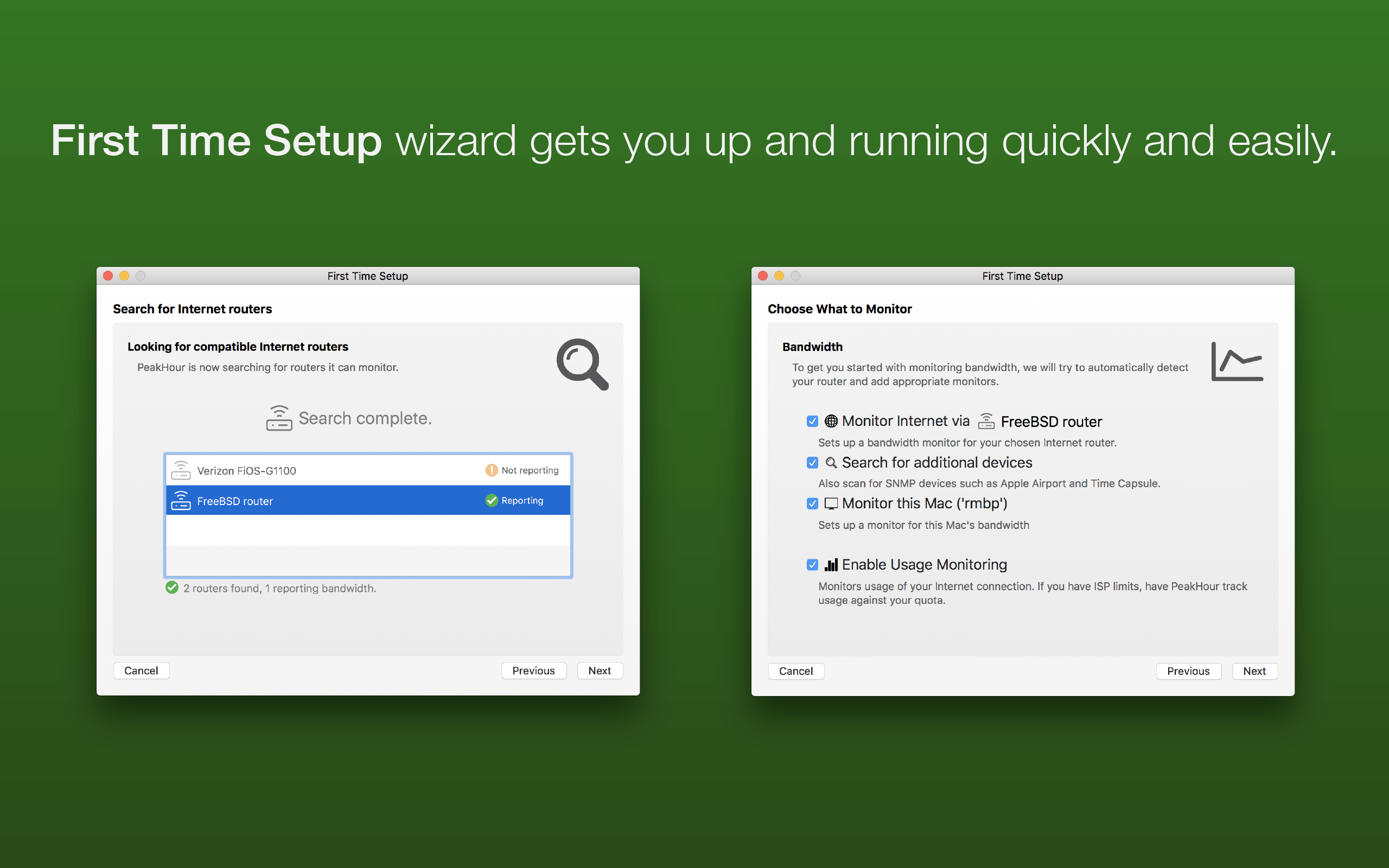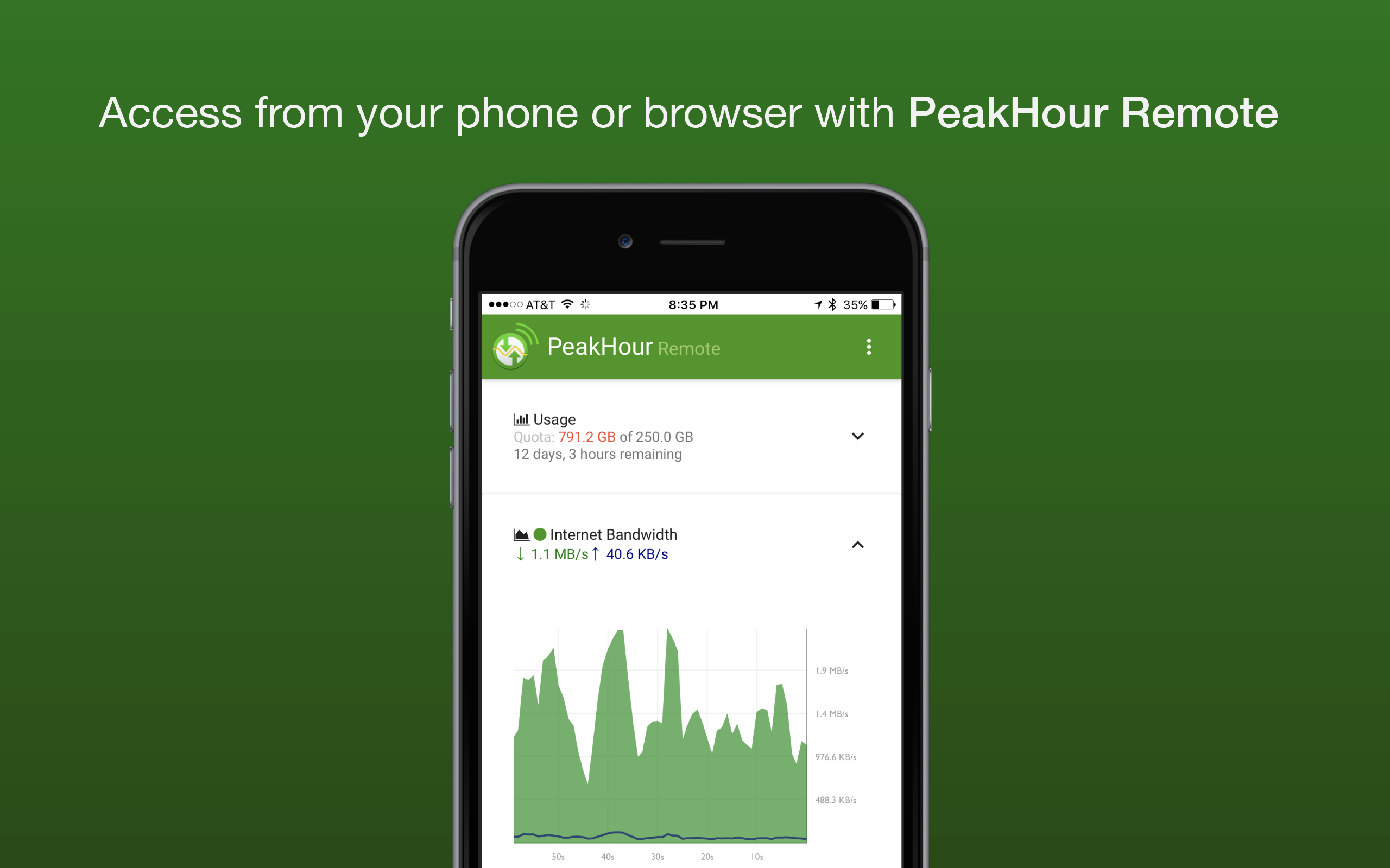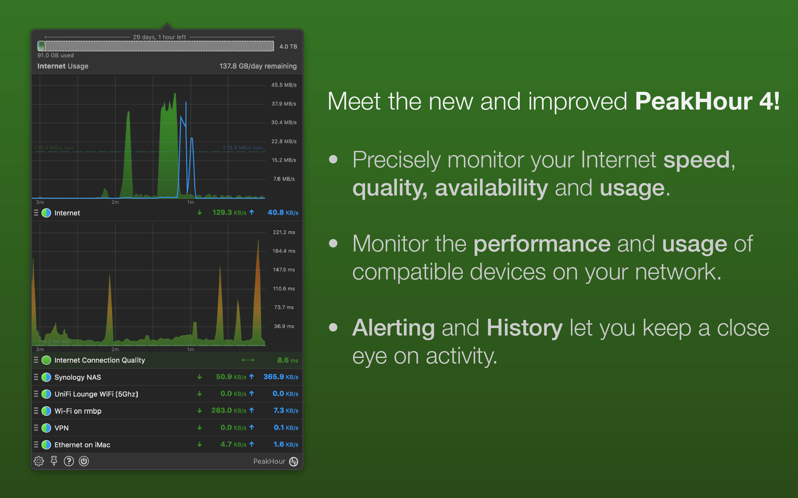 ABOUT PEAKHOUR 4 PeakHour 4 is a beautiful, network bandwidth and network quality visualiser that lives in your Mac OS menu bar and provides instant and historical views of throughput and quality for your Internet, WiFi and other compatible devices. MONITOR YOUR NETWORK PeakHour 4 is perfect for monitoring your compatible network devices*: Internet, WiFi, NAS, servers and more. PeakHour 4 gives you a real-time visual view of how much bandwidth your devices are using. PeakHour 4 can also analyze the quality of your connection, showing ISP and Internet congestion in real-time. Data is collected over time and can be analysed in the powerful History view, which lets you see previous collected data for any time period at adjustable levels of detail. TRACK YOUR USAGE PeakHour 4 can also track individual total usage and can also track your Internet usage if you're on a capped or limited monthly allowance. PeakHour 4 can send email alerts or system notifications as you reach certain usage thresholds. NEW IN PEAKHOUR 4 ? PeakHour Remote: Access PeakHour from anywhere. From any device, point a (modern) browser at the Mac running PeakHour to see a real-time view of your targets and usage. Add to your phone or tablet's home screen for a fast, web-based app available at the tap of a button. ? All new First Time Setup: PeakHour 4 includes a brand new, simplified setup wizard to make it easier to get the most out of it. By default, First Time Setup will try to find your UPnP devices, enable SNMP and monitor your local Mac and set up monitoring of your Internet connection. ? Connection Quality: You can add now a new type of monitor: Connection Quality. This type of monitoring works by regularly pinging a target on the Internet (either the other side of your Internet conneciton or a specific host on the Internet - i.e. netflix.com). By default, First Time Setup will add a Connection Quality monitor for your Internet connection. ? To monitor your local Mac interfaces with PeakHour, just enable the checkbox in First Time Setup or choose 'Monitor This Mac' from the PeakHour menu to bring up the wizard separately. ? Monitoring other Macs on your network has also never been easier. PeakHour Enabler now uses iCloud to sync your Mac's information to PeakHour; adding them now takes just a few clicks. ? Dark Mode: PeakHour now has a cool new look if Dark Mode is enabled in System Preferences. It can also be enabled under Preferences > Display. ? The main PeakHour window is now resizable horizontally, allowing you to increase the horizontal width to see more of the real-time, scrollable graph. Targets can now be manually enabled and disabled. ? PeakHour can now track daily usage quotas, as well as monthly. ? Redesigned primary Preferences UI. ? Improved SNMPv3 support. ? Full macOS Mohave support. ? Much of PeakHour is now written in Swift, resulting in better performance and stability. ? Lots of other enhancements and fixes. USES ? Monitor your Internet usage. ? Monitor the speed and quality of your Internet connection. ? Help determine the optimum placement of your Wireless Access Point for maximum performance or troubleshoot slow WiFi. ? Track how much Internet data you're using to make sure you don't go over your monthly allowance. ? Help troubleshoot Internet performance problems and slowdowns. ? Check your ISP is providing the speed and quality you're paying for. ? Monitor the performance of your network and connected devices: NAS, servers and other network devices.
