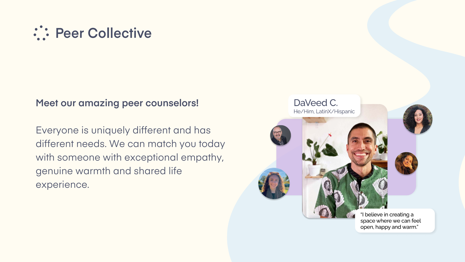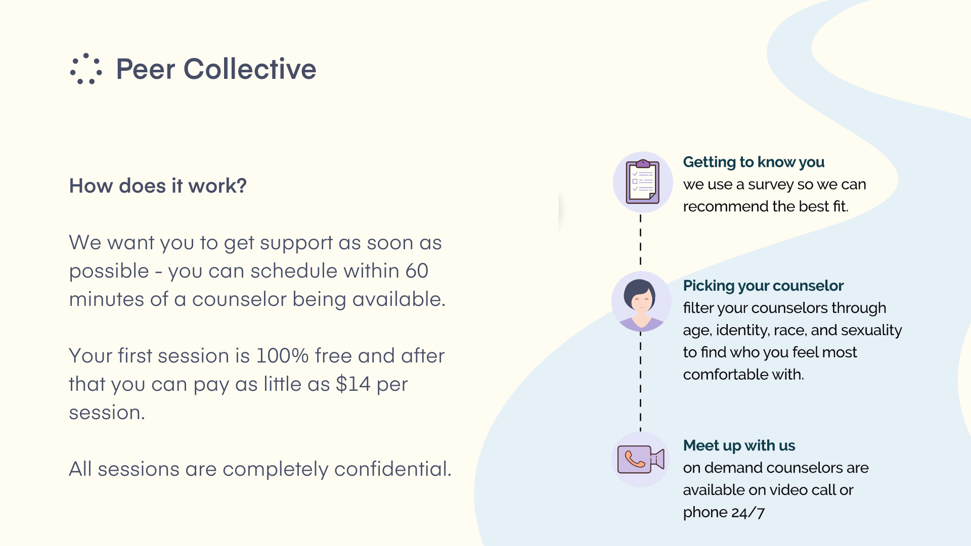 Peer Collective offers affordable, immediate access to mental health support using peer counselors. Our peer counselors are clinically vetted, warm empathetic people with lived experience of many different issues. We help people with support in many different ways. Some people just need someone to talk to - other are managing anger or PSTD. You can choose a peer counselor that best suits your needs easily and quickly by answering 6 questions. The first session is free and then the charge is about $28/hr if you want to come back - that's about 5 times cheaper than visiting a therapist.