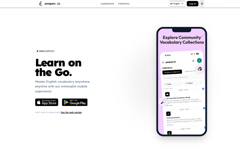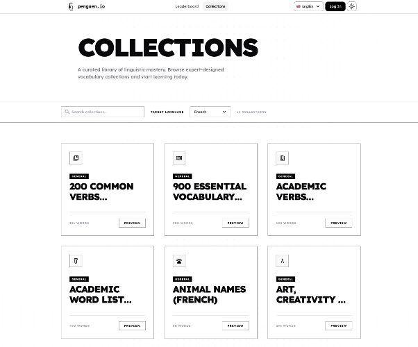 penguen.io is a free vocabulary app built for language learners. Learn the most essential words that cover the majority of daily conversations using science-backed spaced repetition. Choose from multiple practice modes including flashcards, dictation, listen and choose, fill letters, matches and multiple choice. Generate custom word lists, join a global leaderboard, track your streaks and study offline. Supports dozens of native languages. No ads, no subscriptions, completely free forever.