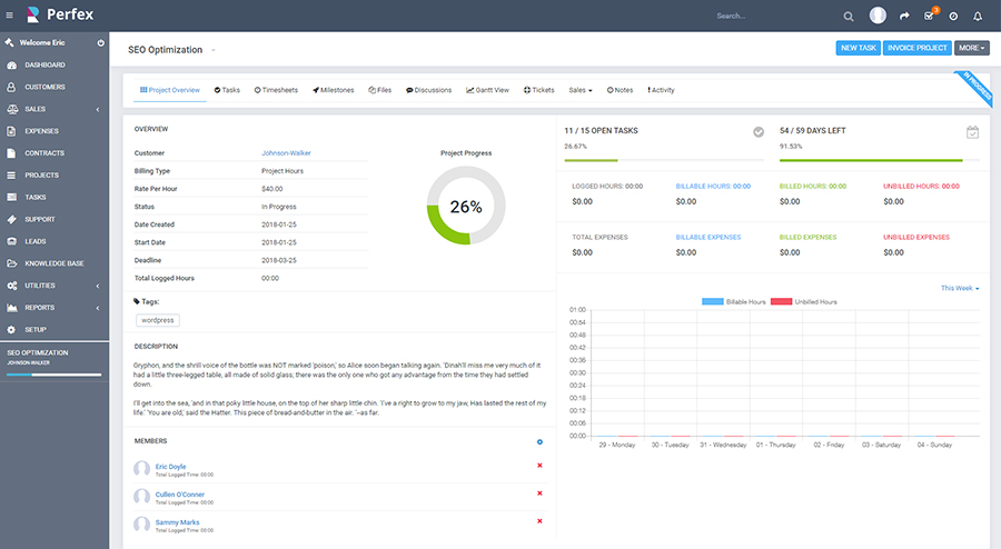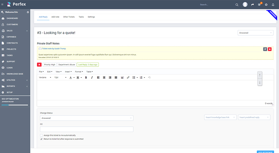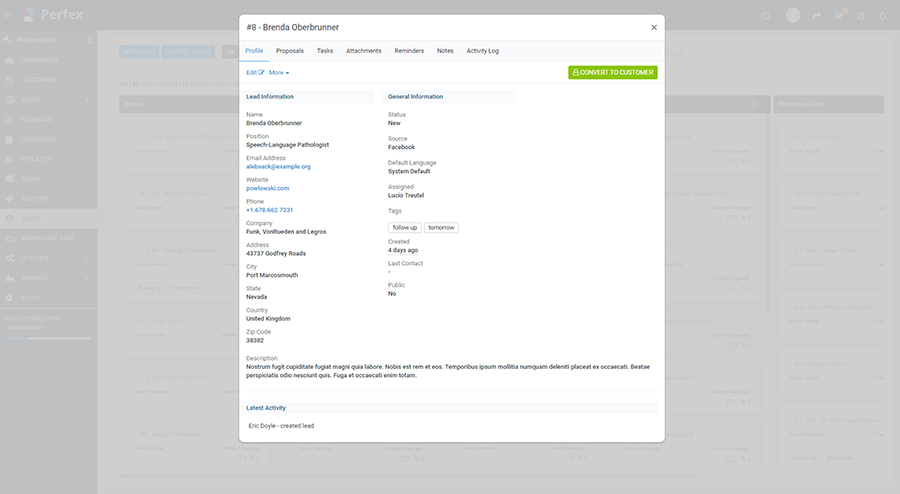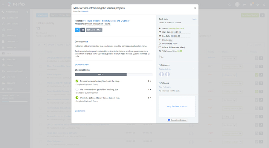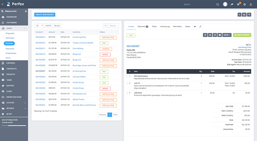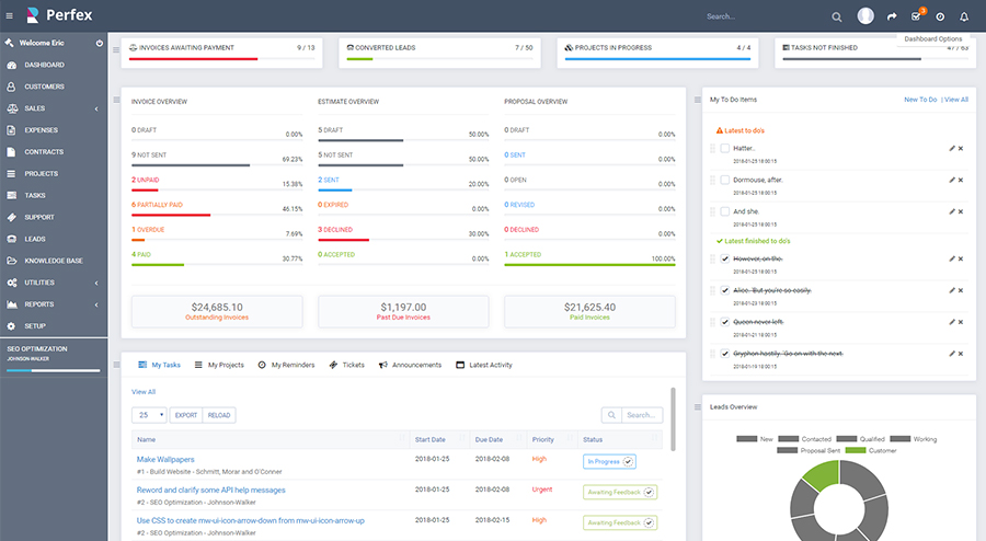 Perfex CRM is complete Customer Relationship Management software that is a great fit for almost any company, freelancer or many other uses. With its clean and modern design, Perfex CRM can help you look more professional to your customers and help improve business performance at the same time. Managing customers is important and Perfex CRM helps in several ways: 1. Manage and invoice projects with the powerful Project Management Feature. 2. Link tasks to many Perfex CRM features and stay organized. 3. Build professional, great looking estimates and invoices. 4. Powerful support system with the ability to auto-import tickets. 5. Track time spent on tasks and bill your customers. Ability to assign multiple staff members on 6. task and track timer per assigned staff. 6. Add task followers even if the staff is not a project member. The staff member will be able to 7. track the task progress without accessing the project. 8. Keep track of leads in one place and easily follow their progress. Ability to auto import leads from email, add notes, create proposals. Organize your leads in stages and change stages easily with drag and drop. 8. Create good looking proposals for leads or customers and increase sales. 9. Record your company/project expenses and have the ability to bill to your customers and auto convert to invoice. 10. Know more about your customers with powerful CRM. 11. Increase customer retention via built-in Surveys. 12. Use the Goals Tracking feature to keep sales goals in mind. 13. Create announcements for your staff members and customers. 14. Use Contracts feature to lock in current and future sales. 15. Custom fields can store extra information for customers, leads and more. 16. Receive payments from Paypal and Stripe in different currencies. 17. Tons of configurable options. 18. Style the CRM to your company branding with the powerful theme styling feature. 19. Separated media folder for non-admin staff members to work inside the CRM and organize their uploads and files. 20. Great looking calendar for each staff member based on staff permissions. 21. Follow-ups, reports, notes, files, and many more features. CRM need to focus on customers and Perfex CRM does that with a powerful support system that helps you track and resolve issues quickly via the integrated ticket system and customer reminders. Assign reminders to yourself, one or many staff members and with one click, reminders can be sent to email and in-app notification system. These features and more can take customer satisfaction to the next level.