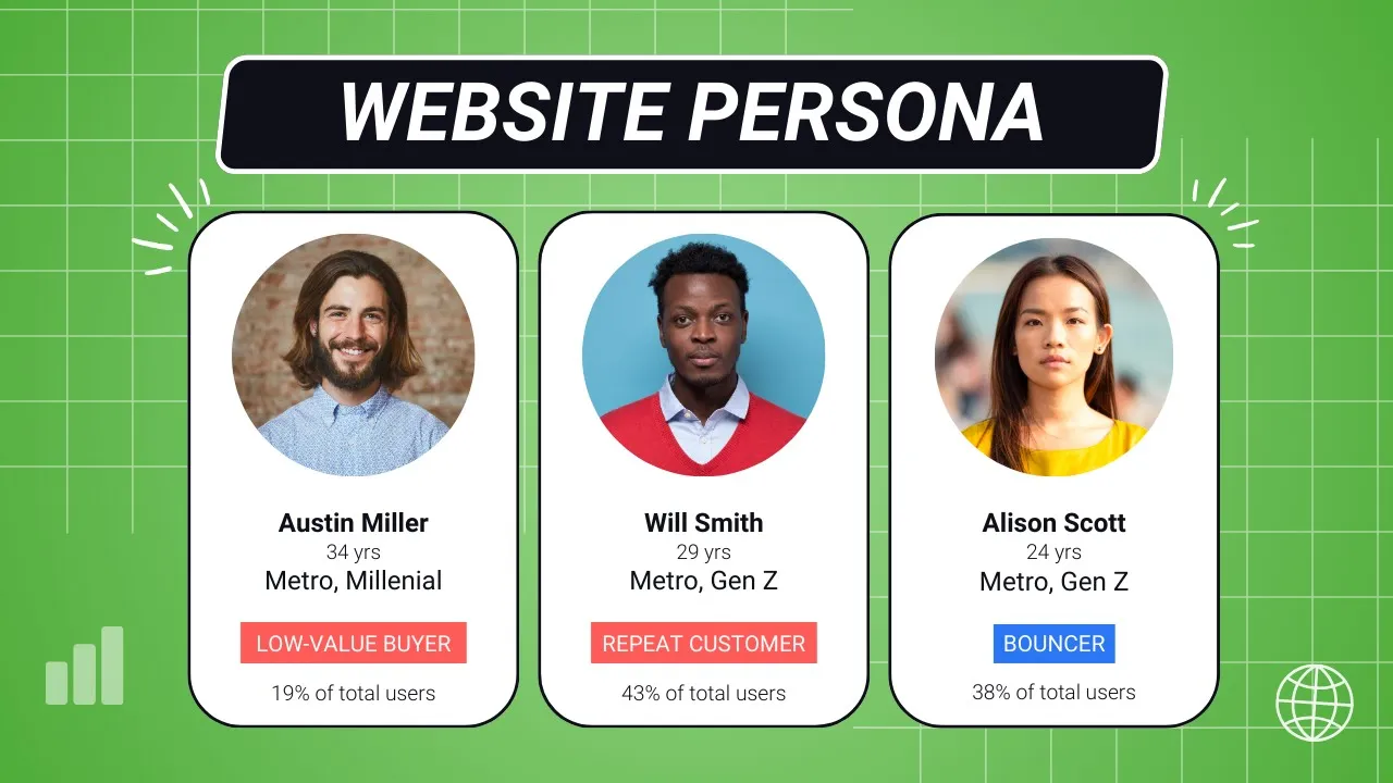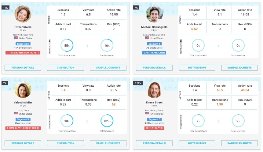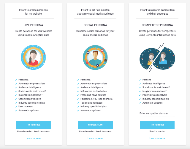 Create data-driven buyer personas for your business and competitors automatically using Delve AI. Get rich insights using Live Persona for websites/mobile applications, Social Persona for social media audiences and Competitor Persona for competitors. 1. Live Persona automatically extracts segment-wise personas and journeys. It works on aggregated and anonymized analytics data from Google Analytics, adds industry specific insights, automatically segments users based on behavior/psychographics/demographics/geographies/transactions, enriches with insights from social media/reviews and abstracts personas for each segment. Gain clarity on best-performing segments, refine customer experiences and get targeting ideas from your valuable segments to grow your business. 2. Social Persona creates social media personas and delivers high-quality market research in minutes. All you have to do is to provide social media handles and Delve AI will create personas of your social audiences automatically for you. Get rich insights for each of your social segments such as followers, mentioners and website visitors. In addition to each segment's demographics, geographies, interests, topics of interest, and industry specific insights, you can understand their online habits and discover best places to influence them. Learn who they follow on social media, which podcasts they listen to, which websites they visit and which YouTube channels they watch. 3. Competitor Persona creates personas for your competitors automatically. Specify one or more competitor domains and our software will automatically generate persona(s) for those competitor businesses. Analyze their users and and uncover marketing strategies with our competitor intelligence.