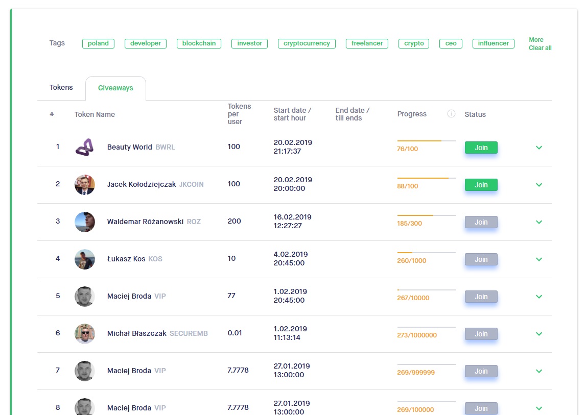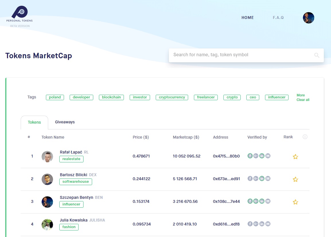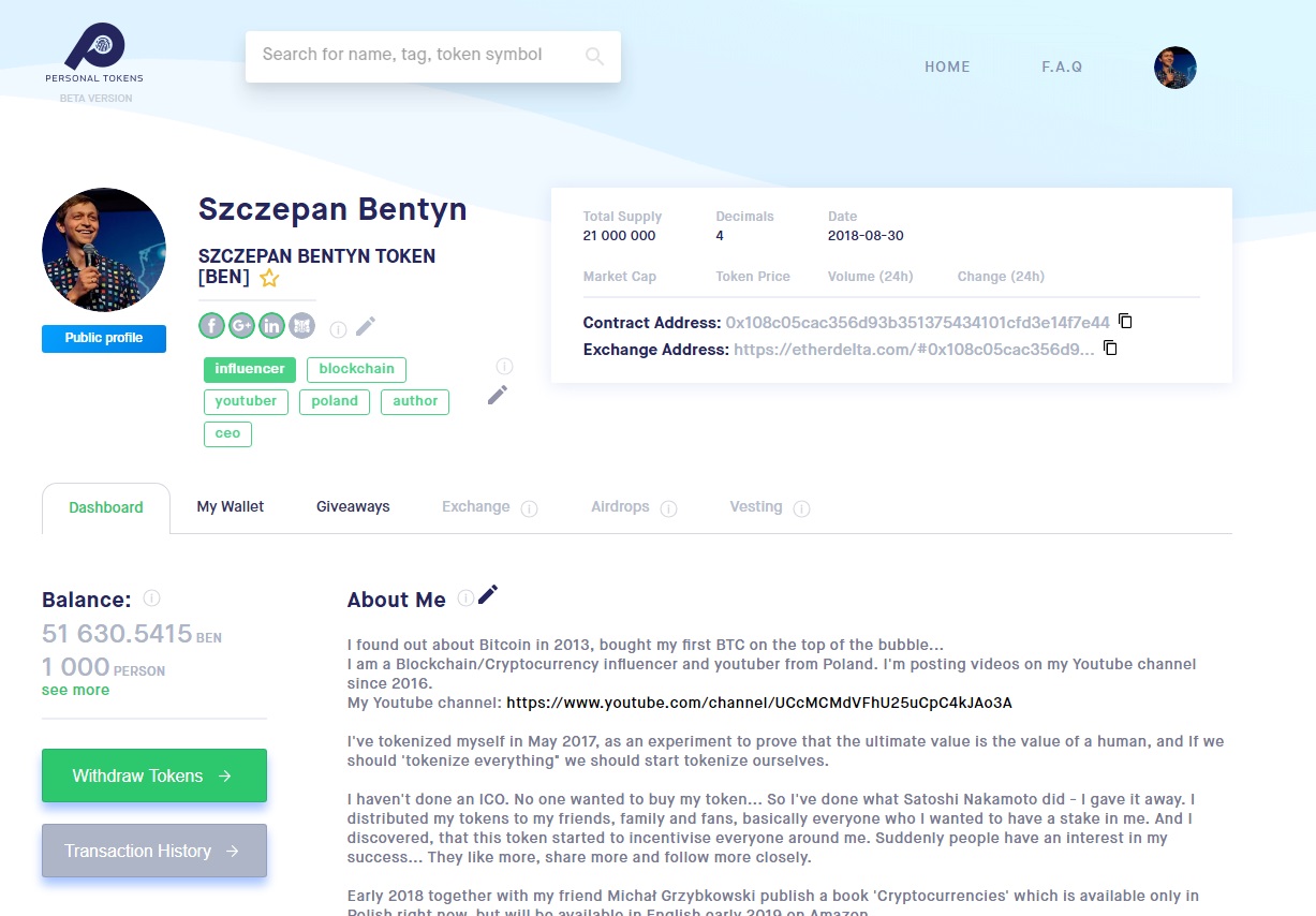 Personal Tokens build on the premises, that if we should "tokenize everything" we should start tokenizing people, because they are the most valuable. Our attention is our currency, and personal tokens enable this attention economy. Our startup is a DAO, which was self-funded. Our founder issued his own personal token in early 2017. After having ton of experience with his token, he decided to build a platform that will help him and other people build their tokens value. PersonalTokens.io is build a base layer needed for this new economy to emerge: 1. Aggregating date - we let people build a credibility, get found, describe themselves, communicate and transact. 2. Issuance - easy token issuance process 3. Distribution - we provide tools that distribute tokens in the way that they incentivise people to become more engaged in your content and public activity. 4. Exchange - we let every tokenized person to be listed on the exchange, and find out his/her market value.