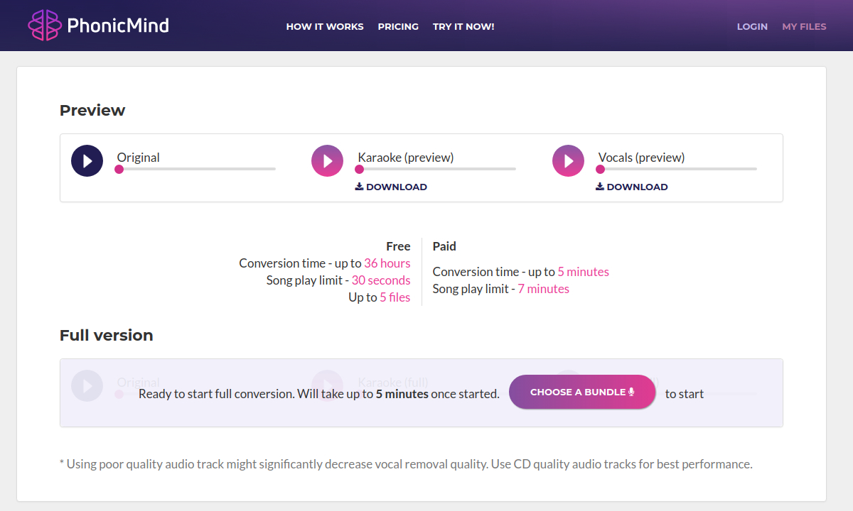 Effectively removing vocals from music was never an easy business. We are changing this once and for all. PhonicMind is a first vocal remover that really works. With PhonicMind you can quickly produce high quality karaoke tracks out of any songs you like.