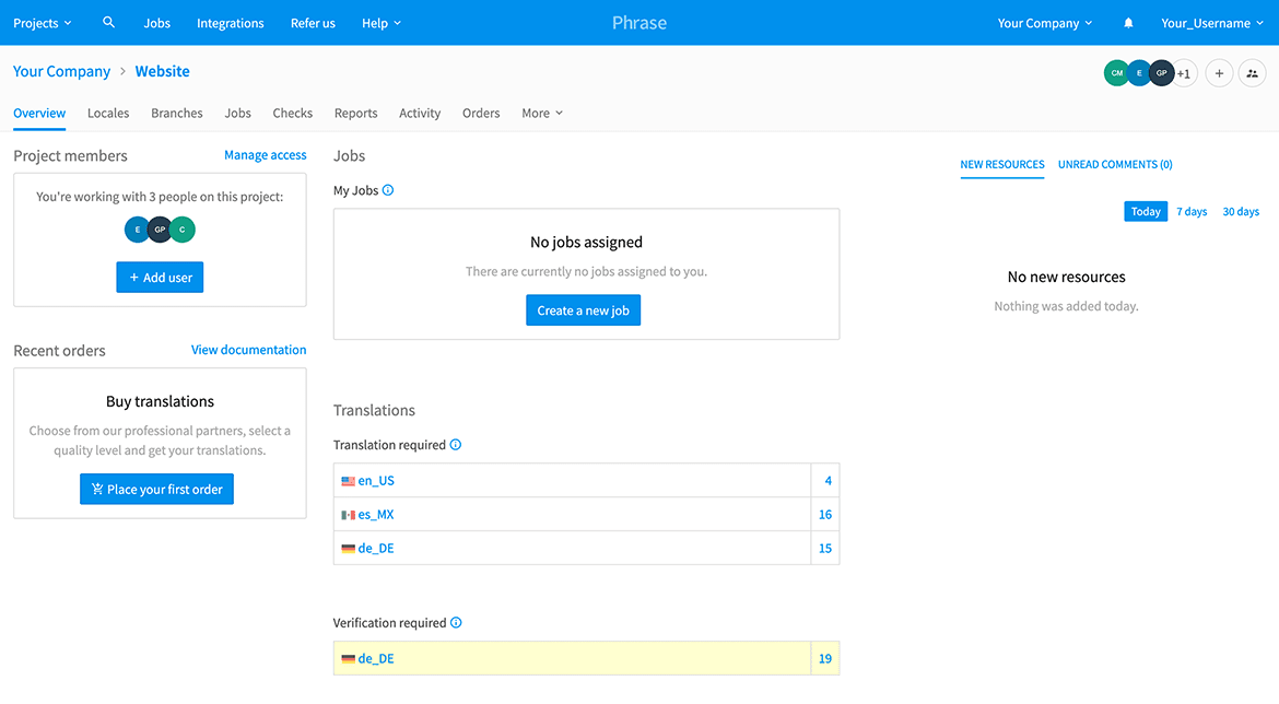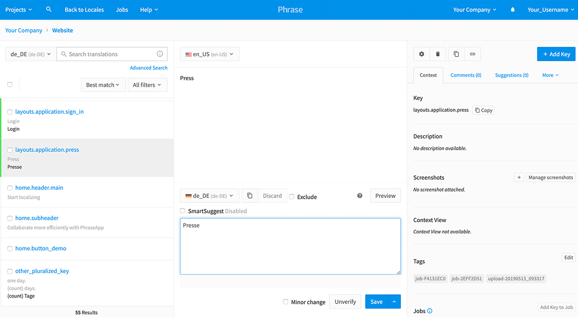 We are the leading software localization platform, and the most reliable way to take a web or mobile application global. Our product helps teams of all sizes to scale their translation processes through smart automation. Trust in your localization process: With the ISO27001 certification and TISAX AL 2 conformity, and with strict adherence to EU data protection policies, Phrase ensures your information stays safe. Bring it all together: Manage your localization on a single platform and collaborate with your whole team online to create a better localization experience for everyone. Adjust quickly: Cut your turnaround times in half right away and scale up your localization process. No more cumbersome manual translation file integration. Improve quality: Phrase provides a variety of features designed to improve your translation quality and consistency, such as a Glossary, Translation Memory, In-Context Editor, SmartSuggest, Checks, and many more. Integrate easily: By providing a variety of integration possibilities such as Phrase’s API, Sketch/Figma plugin, Zapier Integration, Slack Integration, Jira Integration, WordPress Integration, mobile SDK, and GitHub Sync, you can easily integrate the platform into your workflow. Keep it simple: Phrase’s API is designed to fit all software localization processes. You can easily import locale files, download locale files, tag keys, or interact in multiple ways with the localization data stored in Phrase through the API. Coordinate your team: Organize all your translation tasks by assigning team members and setting due dates to the locales of your choice. Phrase also has an access rights management which allows big organizations to manage projects and users efficiently.