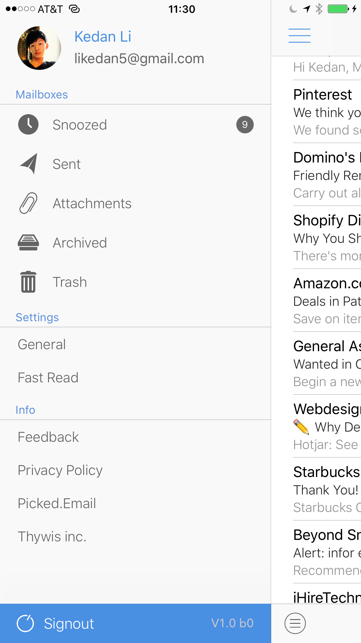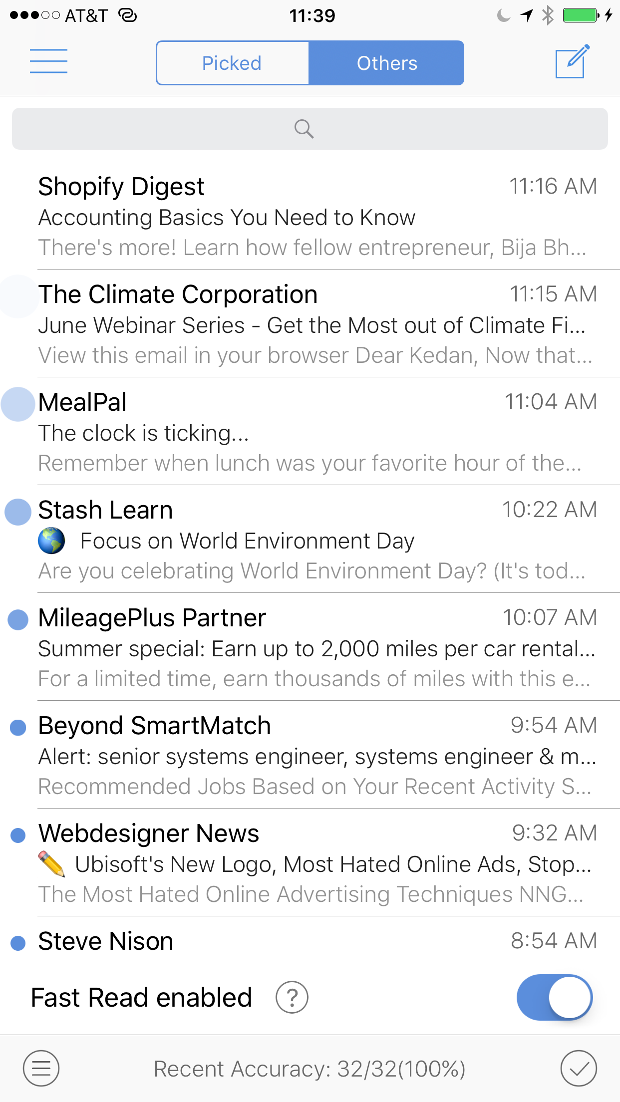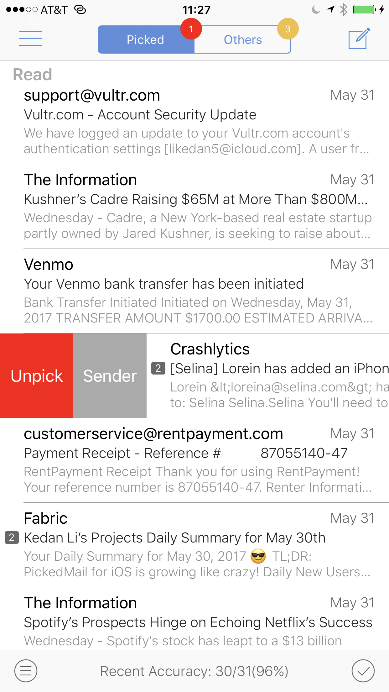 Getting a pile of emails everyday? PickedMail is true personal inbox that will save your time - PickedMail learns to pick your emails based on what you taught them. - Teach it once, PickedMail listens and adapts to your preference. - Fast Read and Bulk Archive help you skip emails not important to you. Technical side: While most email applications use generic model trained with large amount of data, PickedMail creates a unique model only using your data and updates it constantly according to your latest preference. It starts with a generic classification, but once you start using it, it quickly adopts your personal preference. Expect it to reach above 90% accuracy in three days.