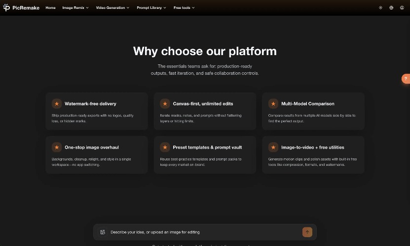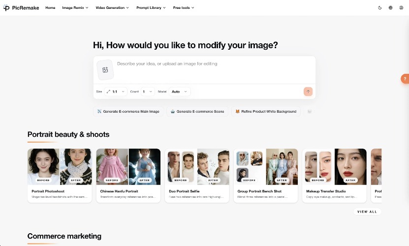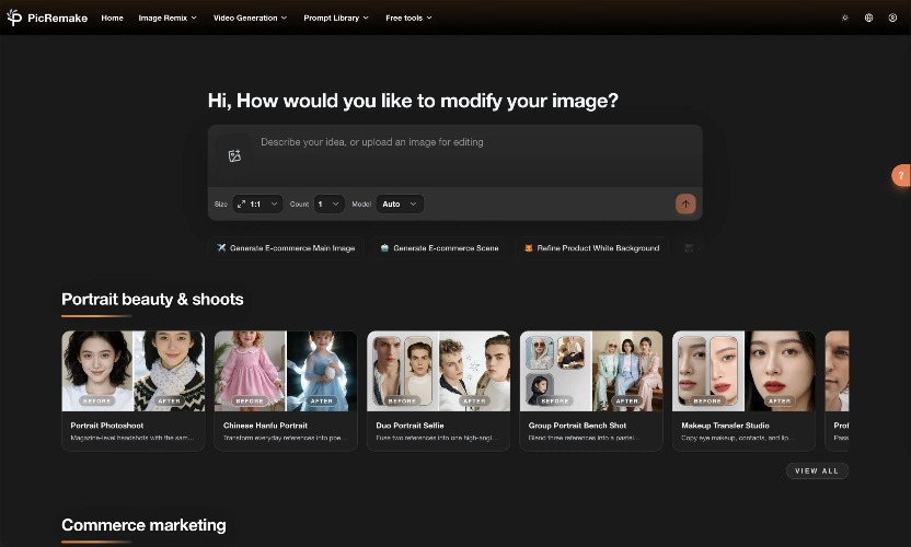 🚀 PicRemake: Your All-in-One AI Creative Studio — Where Every Image Has Infinite Possibilities! In the era of digital creation, are you still struggling with complex editing software, high modeling costs, or repetitive design templates? PicRemake is a comprehensive AI imaging platform that integrates the world’s leading AI models. Whether you are an e-commerce entrepreneur, a professional designer, a content creator, or an AI enthusiast, PicRemake provides a one-stop visual solution to turn your ideas into professional-grade masterpieces instantly! 🔥 Core Highlights: Why Choose PicRemake? All-Star AI Model Lineup: Powered by top-tier models like Flux, Runway, Kling, Stable Diffusion, and Google VEO. Access the world’s best AI tools in one place. 100% Watermark-Free: Every generation is watermark-free and fully supports commercial use, allowing you to monetize your creativity directly. Lightning Fast: Get results in 5-30 seconds. Even complex tasks are delivered with high efficiency. Zero Learning Curve: No need for complex prompt engineering. Simply upload an image or select a template to achieve cinematic results. 🎨 Key Feature Modules 1. 📷 Portrait Enhancement & Artistic Photos Style Transformation: Instantly turn into a Ghibli anime character, a Family Guy pixel art figure, or create high-end traditional Hanfu portraits. Professional Retouching: Magazine-level portrait retouching, automatic ID photo generation, and even Makeup Transfer (apply any makeup style to your face with perfect facial proportions). Multi-Person Interaction: Supports dual or multi-person photo synthesis while perfectly preserving the unique facial features of every individual. 2. 🛍️ E-commerce & Commercial Marketing Virtual Try-on: AI-powered try-ons for bags, clothing, and jewelry with perfect strap details and ergonomic matching, saving you the cost of expensive model shoots. Scene Swapping: Place products in stunning 3D backgrounds and automatically generate marketing layouts that drive click-through rates. One-Click Clean-up: Automatically erase unwanted logos, text, or cluttered backgrounds while keeping the core product intact. 3. 🎬 Film, Gaming & Storytelling Storyboard Generation: Convert text or reference images into coherent comic panels or cinematic storyboards. Character Design: Generate character "sheets" (front, side, and back views) and design weapon or prop upgrades. Motion Graphics: Supports Image-to-Video using Sora and Wan2.6 technology to bring your static images to life. 4. 📐 Graphic Design & Toolbox Logo to Mockup: Upload a logo and instantly generate full sets of packaging, apparel, and merchandise mockups. Poster Reconstruction: Keep the main subject while changing the background style, text content, or aspect ratio with one click. Essential High-Freq Tools: Precision background removal (99% accuracy), lossless upscaling, image compression, and format conversion—all available for free.