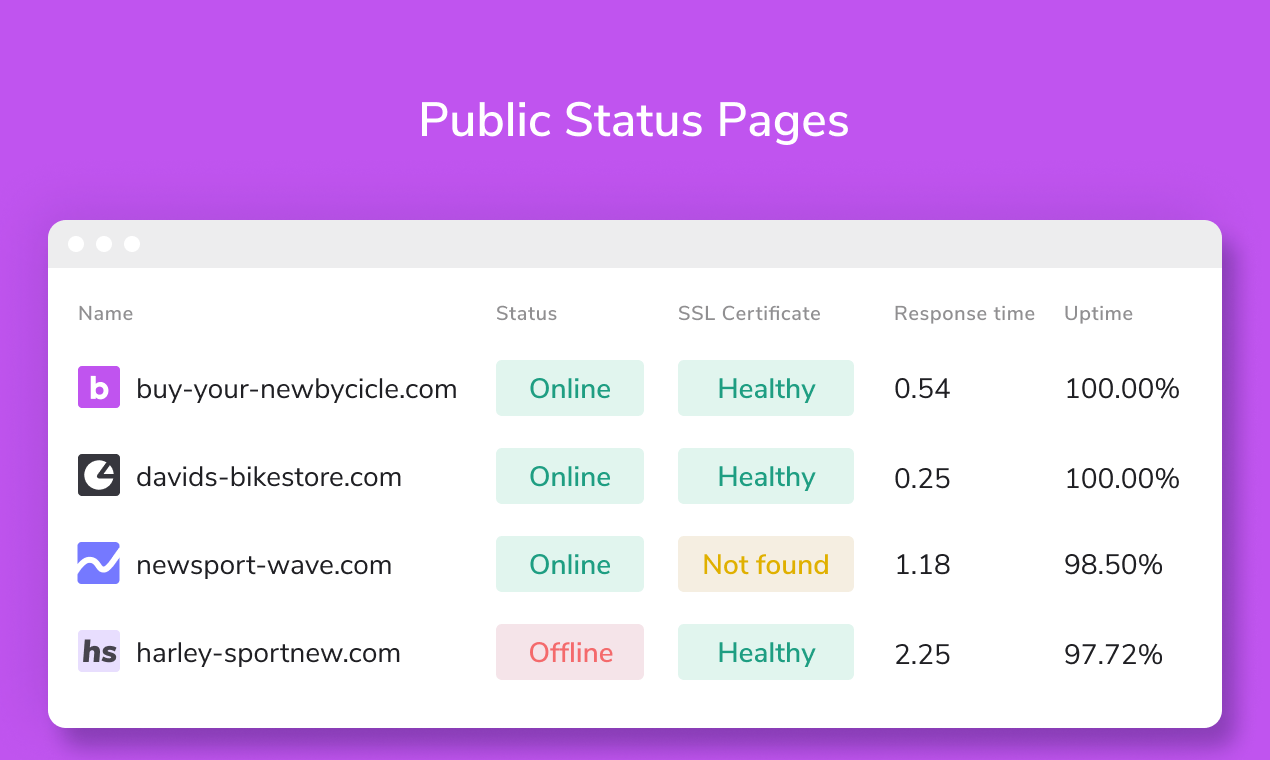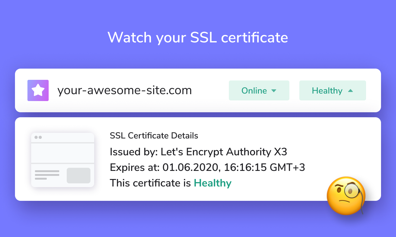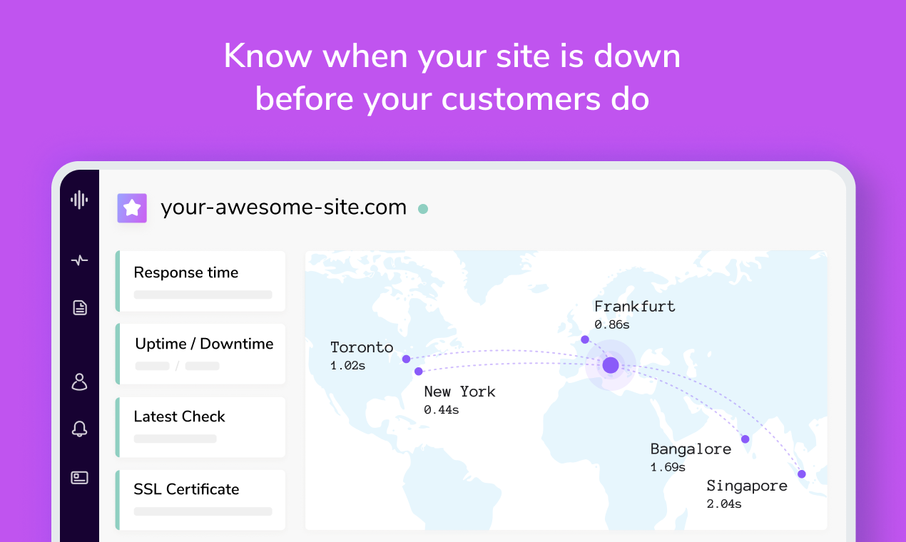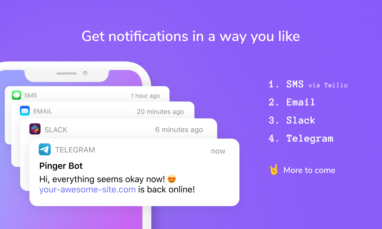 Know when your site is down before your customers do. We monitor your site and certificate in realtime. When it's down we send you notifications via email, Slack, Telegram or SMS.