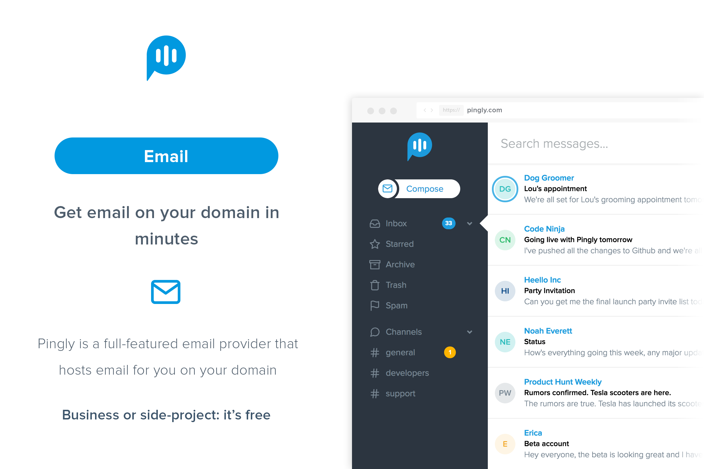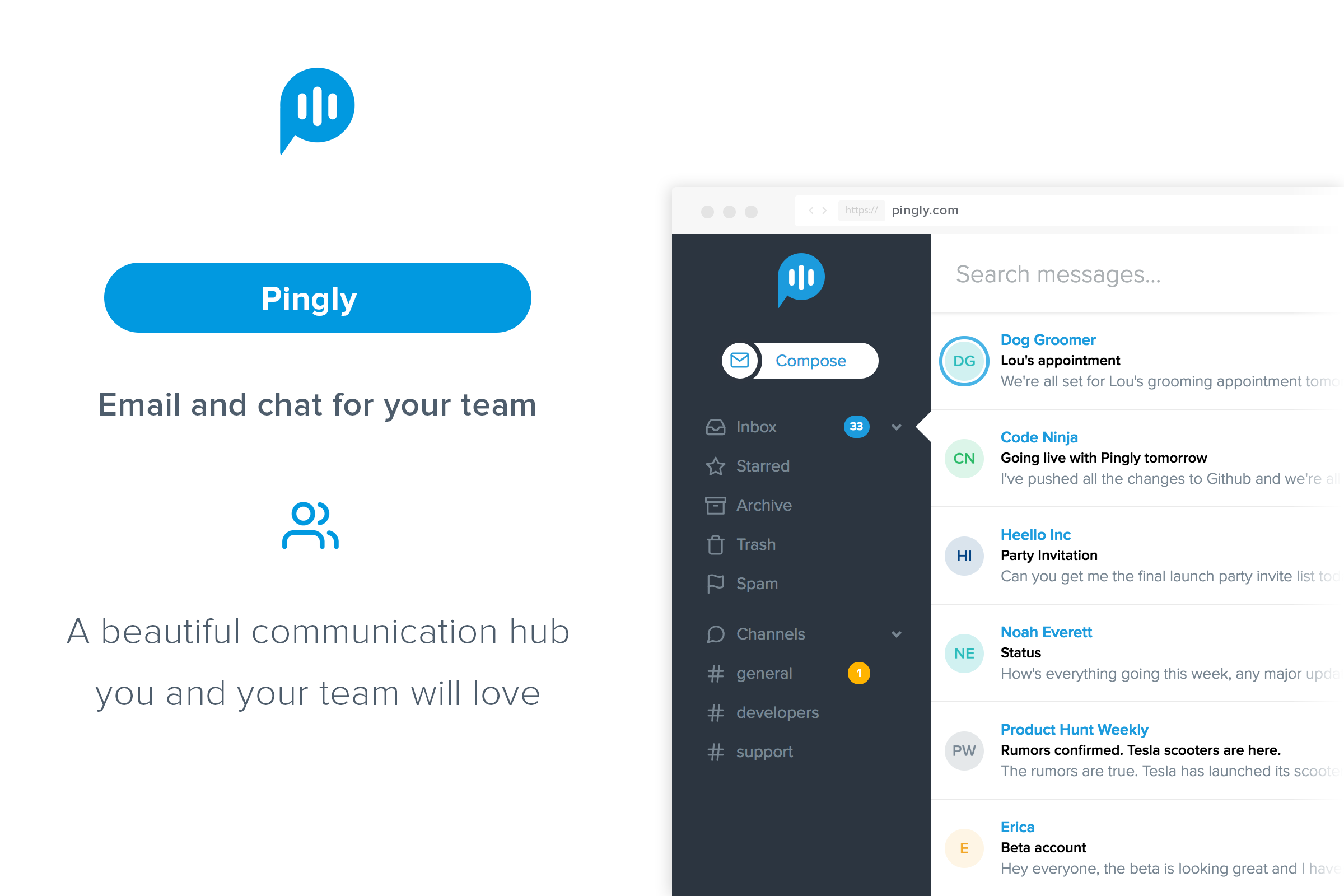 Pingly. A beautiful communication hub you and your team will love. Use one app and stay focused with all of your company's messaging in one place ? Pingly is also a full-featured email provider that hosts email for you on your domain. Get email for your business or side-project in minutes - for free.