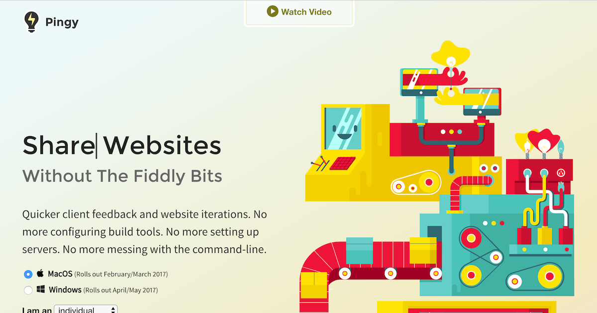 Pingy helps you to prototype, create, share and deploy websites. Quicker client feedback and website iterations. No more configuring build tools. No more messing with the command-line.