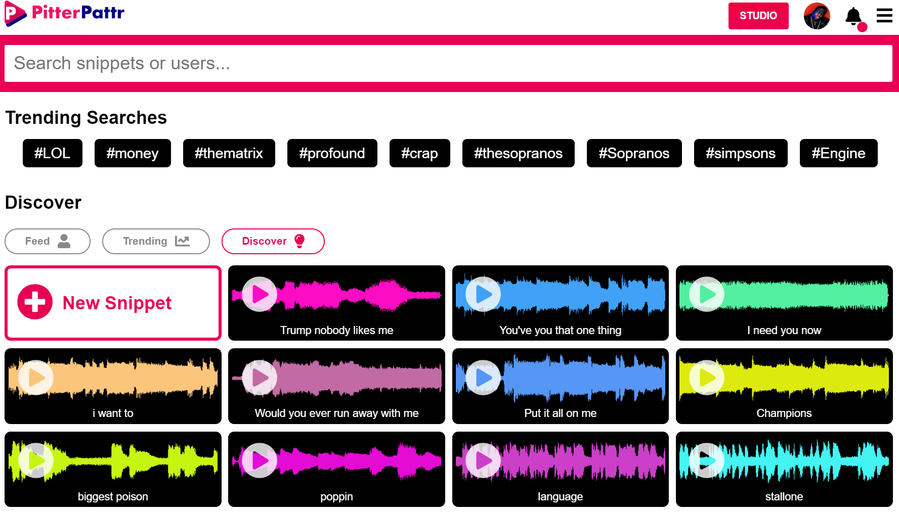 Like GIFS but Sounds! Sound is not the future - Sound is now - if you are someone who believes that sound can evoke emotion - who believes that sounds can make you sad - who believes that sounds can make you happy - sounds can motivate you...to do incredible things.. - then we have a platform for you. The Pitter Pattr platform is built up from ‘Snippets’, an innovative short-sound format that bares no bounds. Snippets consist of popular catch-phrases, your favourite movie quotes and a whole lot more! The best part? You can create your own Snippets and share them with the world! Once you have created an account, head over to the Studio and use one of the available upload formats to bring your Snippets to life! Once you have created your Snippets you can share them with your friends, family and colleagues through all popular digital messaging platforms - make people LOL, cry and cringe in a way only sound can. Joining Pitter Pattr is free so sign up for an account and join the Pitter Pattr community today.