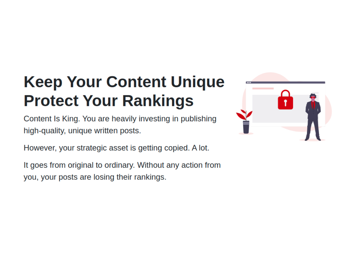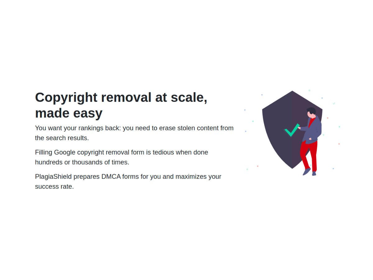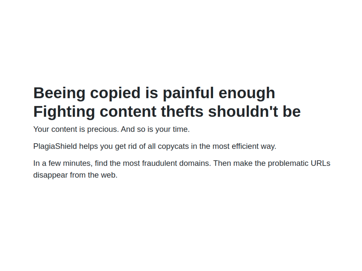 PlagiaShield helps website owners fight content thefts. It is in public Beta for now. I would love to hear your feedback! Content Is King. Those who heavily invest in high-quality written posts need to protect their strategic asset. PlagiaShield finds all potential thefts and helps you get rid of them. 1. Enter your domain. 2. Take a deep breath when discovering the results. Yes, you got copied. Much more than you thought. 3. Check the most fraudulent websites: ask them to pull off the problematic pages with the email PlagiaShield wrote for you. 4. Check the most copied pages. PlagiaShield prepared the Google copyright removal form (DMCA) for you. Fill your complaints. 5. Once the fraudulent content disappears from Google and the Web, watch your rankings grow.