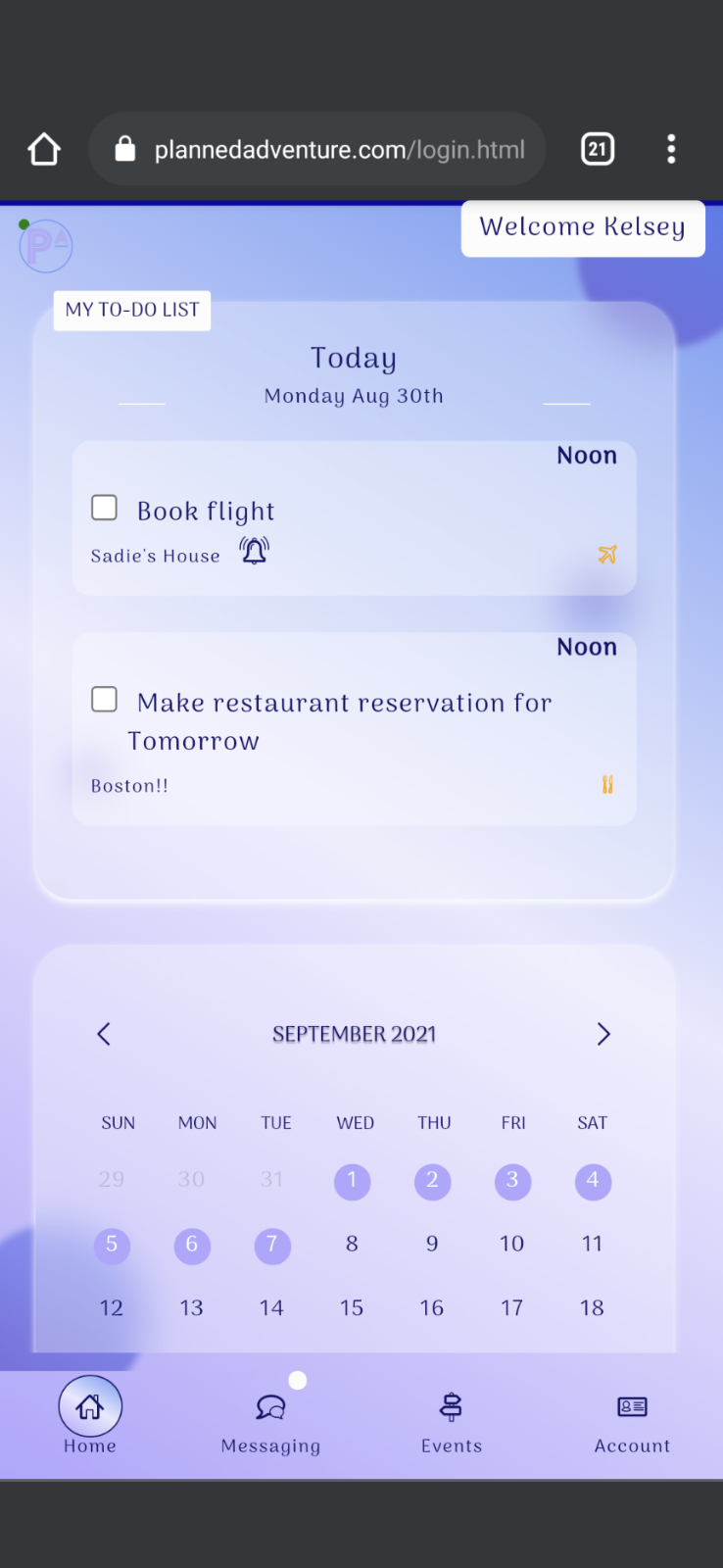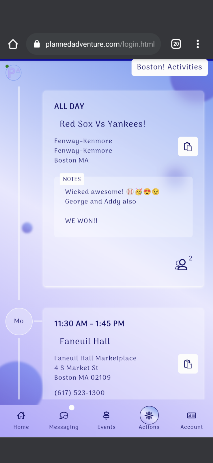 Have you ever taken a trip, a family vacation, or held an event? Maybe had a holiday get-together with friends and family? We have! And there can be a lot that goes into the planning and organization. Family holidays, vacationing, weekend get-a-ways are happening more and more each year. Maybe it’s a tradition. Unfortunately, finding a way to stay organized for not only yourself but everyone involved is remarkably difficult and, until now, involved using a half dozen different apps and finding a communication channel that works with everyone. That is why we created Planned Adventure. We believe there should be an easy way to travel, plan holiday gatherings, take spontaneous weekend trips, and more while keeping everyone in sync. Planned Adventure is your personal assistant when it comes to traveling and event planning. Planned Adventure makes it extremely easy for everyone to get involved! Who needs stress! We’ve included over a dozen different tools to help take the stress out of planning and organizing trips & events. Look at the awesome ways Planned Adventure helps you stay organized! Overview & Itinerary Attendees & RSVP Activities Meals Lodging Flights Ideas To-Do and reminders Notifications galore Supplies Memories! Receipts Messaging Map! Directions Privacy Traveling for business? Coming soon... What exactly does Planned Adventure offer? ~ one spot to manage everything! ~ add activities, lodging, and meals in advance - or - just use our convenient ‘Near Me’ feature to get the map of places right where you’re at. And for campers there is a special ‘Tag Me’ that’ll just use your GPS coordinates as your lodging. ~ Easy RSVP system included in the SMS messaging system ~ Easy Notification settings system using either the dashboard or the SMS messaging system ~ Instantly create a group chat using a SMS number specifically assigned to your event. ~ Advanced reminders and event notifications using SMS messaging system or PUSH notifications ~ Everyone can have their own supply list and the Host can assign supplies to anyone ~ Everyone can have their own To-Do items and the Host can assign To-Do items to anyone ~ Attendees can mask their phone number from other Attendees for privacy ~ Keep track of receipts (you can also add a pic of the receipt, can be marked as private) and always be able to find the receipt in case you ever need it. ~ Much more! Make the most out of your trip or event. Whether you are planning everything in advance or not, Planned Adventure has everything you need to capture the whole event and make a great event log/digital scrapbook for years to come.. There’s nothing to download! You don’t have to convince everyone to go to the App stores. Just go to the Planned Adventure website and you can install it right on your homescreen. It’s new technology! Getting started is easy and FREE! Create your first adventure TODAY!