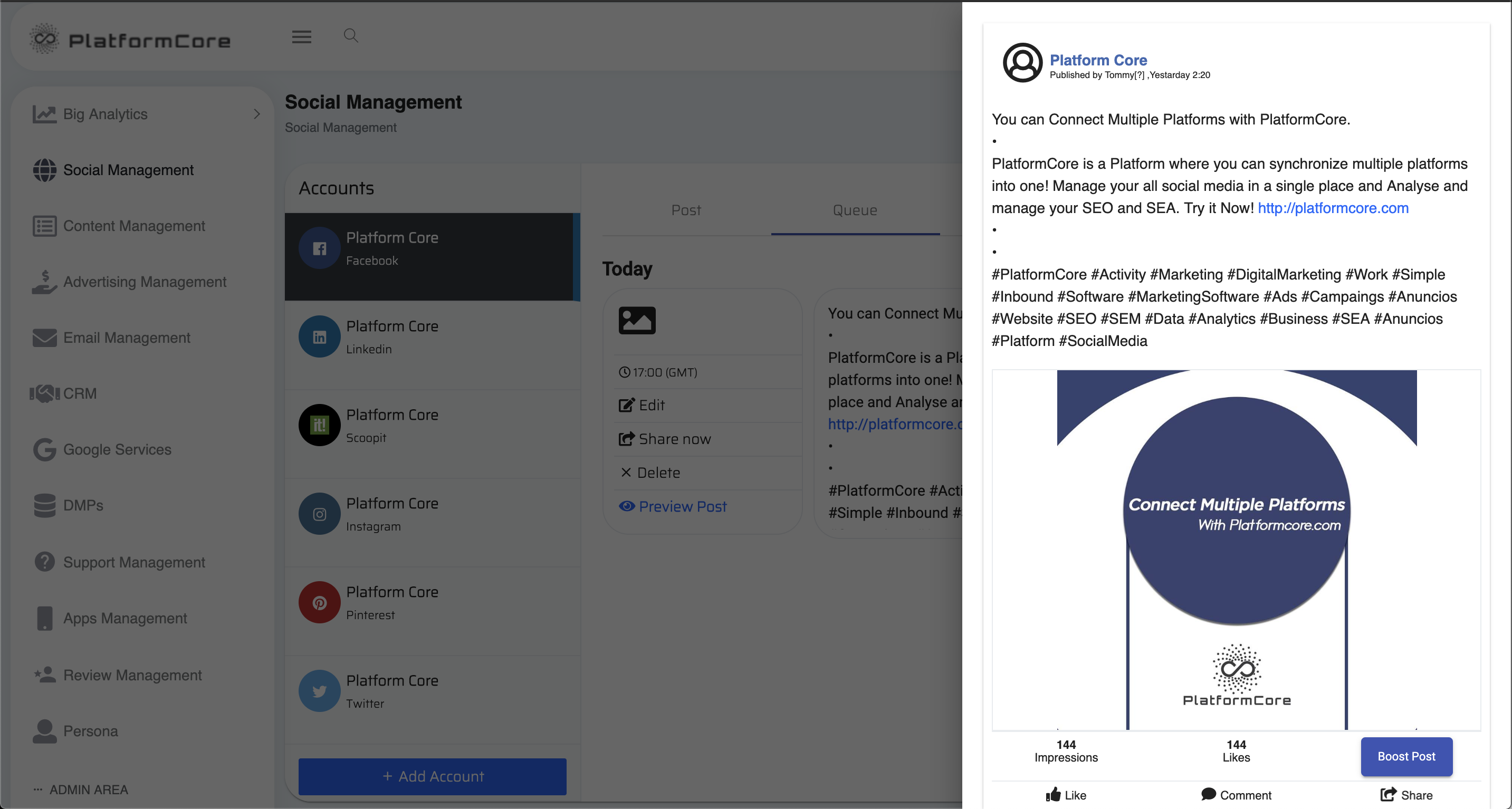 PlatformCore: The new way to marketing for small, medium and large businesses. There are so many marketing strategies, channels, and campaign that businesses use to boost their visibility and raise awareness about their brands. Organizing all these tasks together can be cumbersome and overwhelming to keep track of its progress. What if there is a platform that can help you take care of all that? Oh, there is now. PlatformCore was founded to be the one-stop solution to marketing problems faced by businesses. PlatformCore helps businesses to improve their working methods. Providing a simplified approach to marketing with a platform where you can integrate every other platform you uses for efficient management to improve productivity. Every interaction you make within the platform will have an impact on others and improve your return on investment by saving time and valuable resources.
