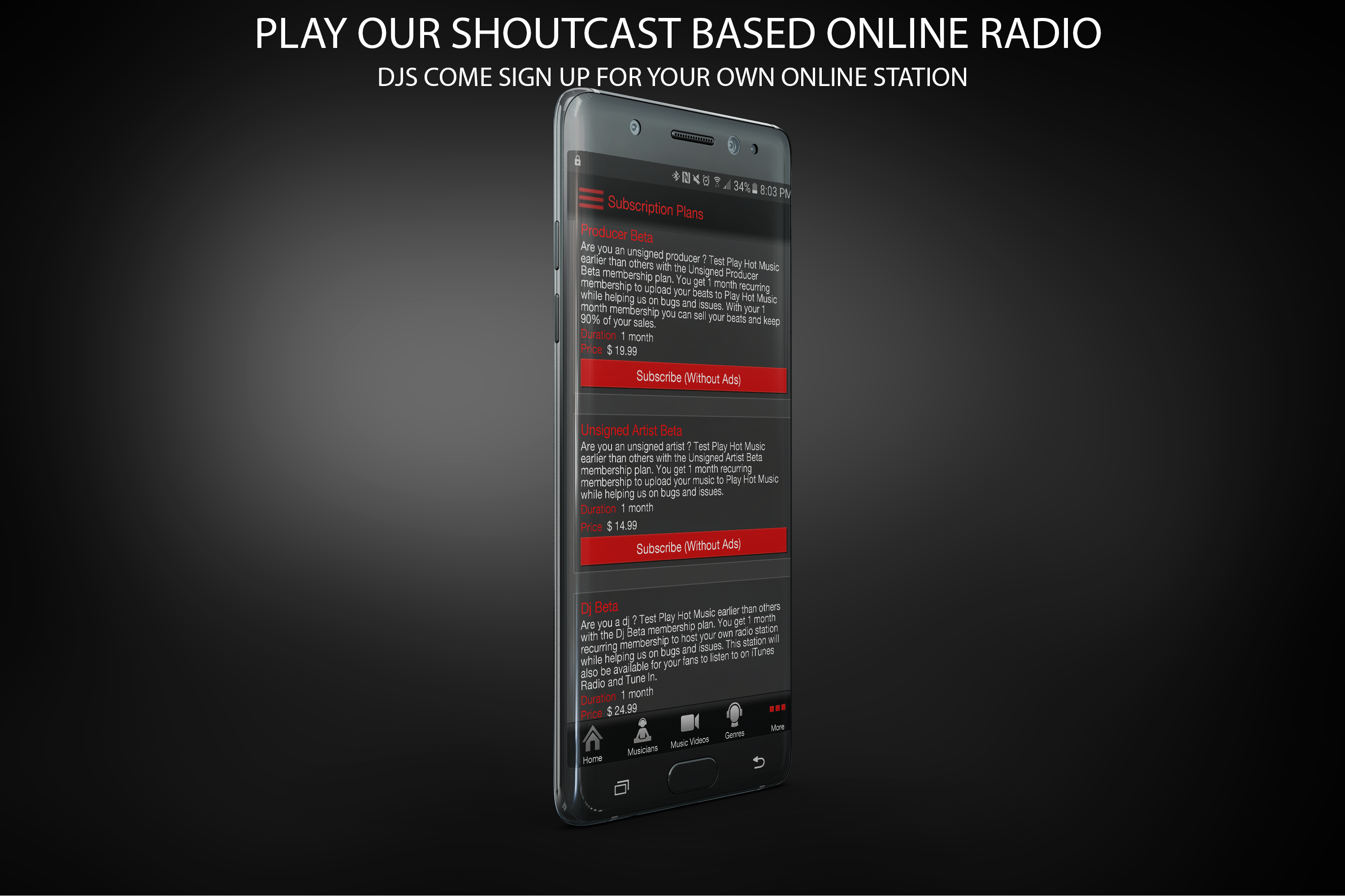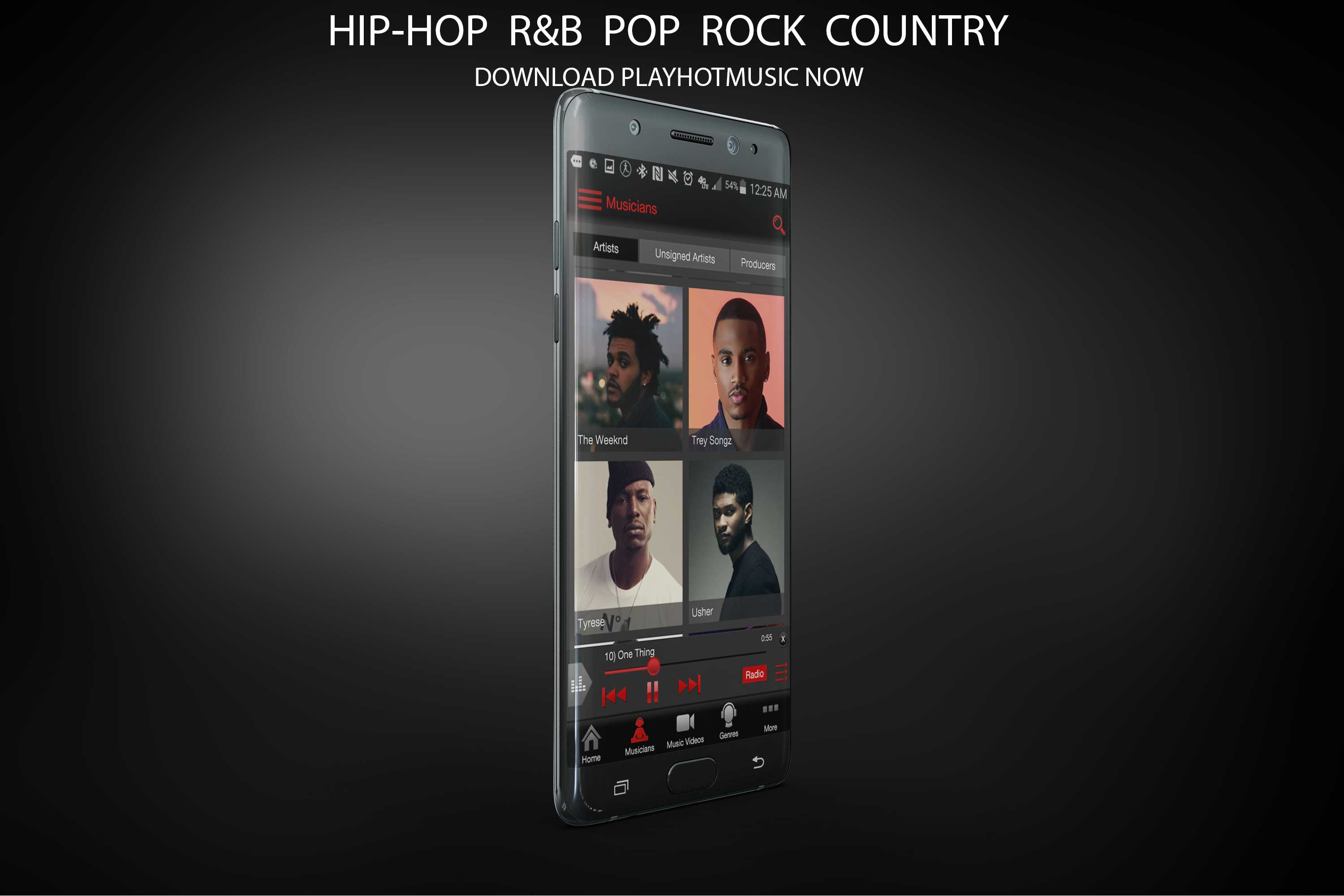 Access Hip Hop, R&B, Pop, Rock & Country music Access News and read Interviews Play music Watch Music Videos Rate the application Access artist biographies >View upcoming albums (Album Release Timer) >Watch music videos Search & Browse music Purchase beats (Custom Made) Download all songs for offline streaming Create a playlist of your favorite songs Share Albums to Twitter, Facebook, Google, or Email UNLIMITED MUSIC STREAMING Listen OFFLINE – no internet connection needed Online Radio provided by PlayHotMusic Djs Social Media Features: Sign in with Facebook Register with email View everyone's activities, add friends, send messages, create events, posts status, take and post pictures, videos, and voice recordings All songs are in high quality Features: Music Search Search for artist Add songs to playlists Listen to music over wifi, 3G, 4G, and LTE networks Play, Pause, Next and Previous. Below are all genres available Hip Hop R&B Pop Rock Country