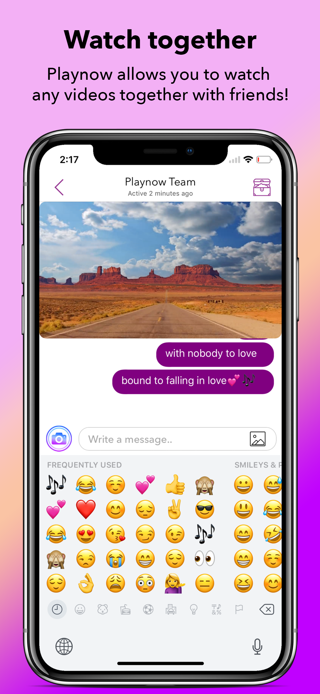 Playnow - Watch together is a new age video sharing app that allows you and your friends to watch videos together on both of your phones at the same time. No more crowding around phone screens or sharing links. Watch a video in live time within a chat of up to ten friends! ? In addition to videos, Playnow allows for simultaneous music listening across devices. Turn a room of iPhones into a stereo system! Just swipe right while texting your friends to find a video or song to be played in the chat across all devices. Watch together anywhere!