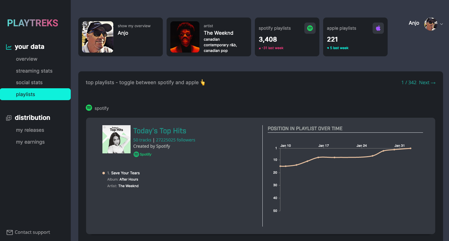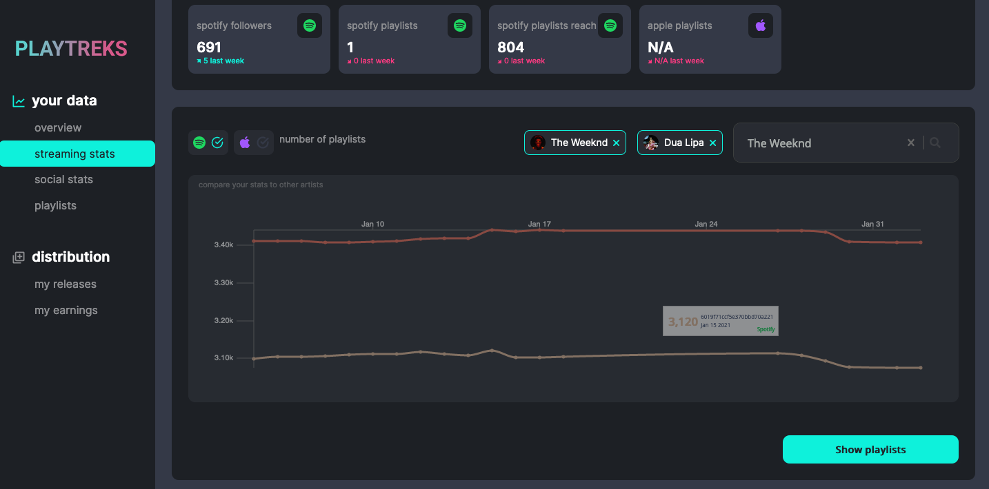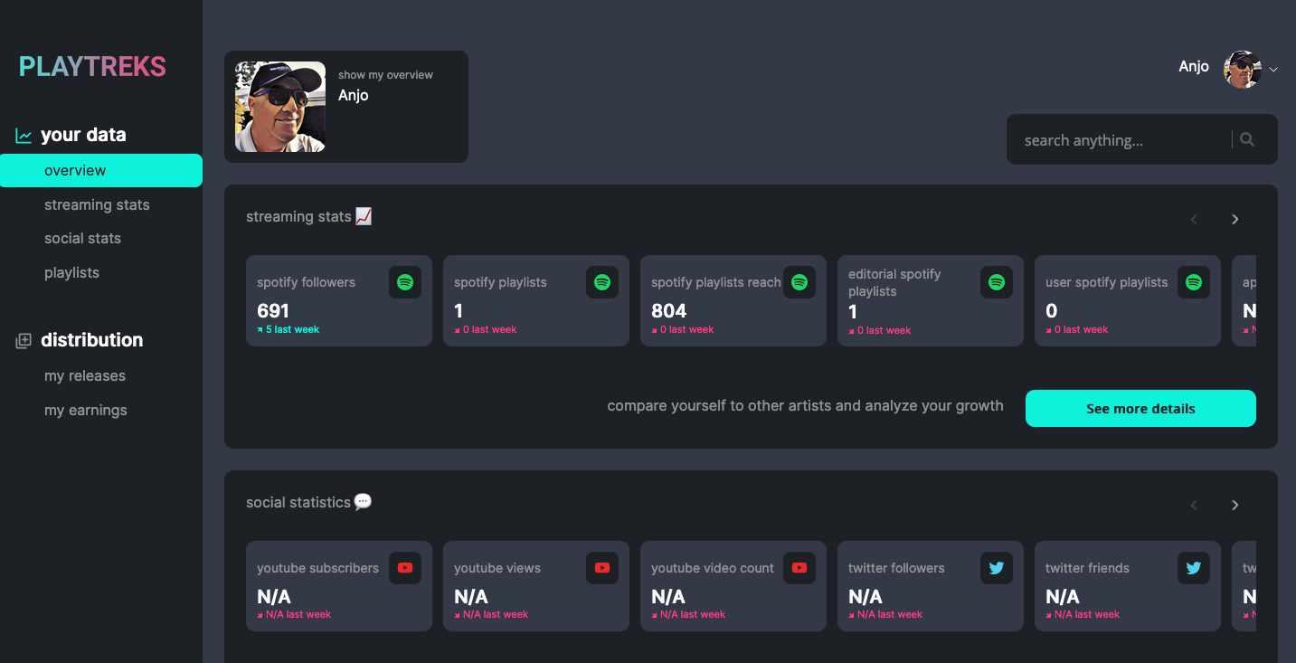 distribution to all major streaming stores, keep all royalties, track music in the artist data dashboard and discover music in charts & playlists, insights from social media, and find out what people are listening to, all in ONE place PlayTreks is a data analytics company for the music industry and enables users to analyze the acquired data and use them as required. PlayTreks data analytics services can assist in product development, identifying potential market gaps, improve efficiency, extend reach and much more. A artificial intelligence driven marketing SaaS platform for the music industry which provides full transparency about the retail performance of content sold on a variety of digital streaming platforms, including Spotify, Apple Music, social media, content sharing platforms and more.