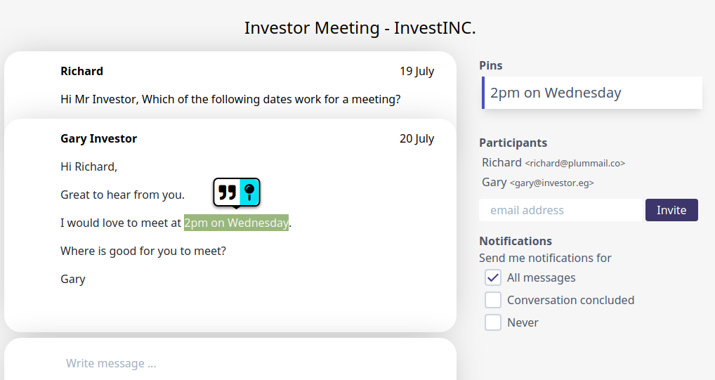 Plum Mail is a replacement for email and instant messengers. We find both so frustrating! Email is disorganised and IM is distracting. We want to fix this and keep email's best feature: the fact everyone has an email address. Plum Mail gives us the opportunity to build something better. We're making conversations more useful, better organised and more meaningful. In Plum mail you can conclude conversations, keep track of key points by pinning, send structured replies, and control expectations about when you check your messages.