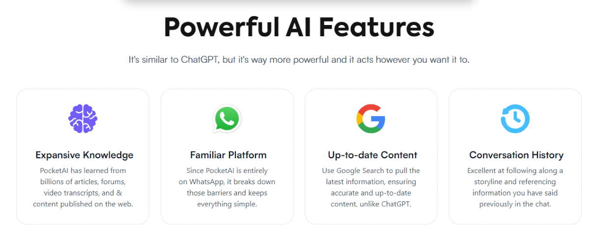 Get Ready to Transform Your WhatsApp Chats with PocketAI! 🌟 Imagine turning your everyday messaging app into a hub of creativity and smart communication. That's what PocketAI, powered by OpenAI’s GPT-4 Turbo, brings to your WhatsApp experience. It's like adding a super-smart friend to your chat list who's ready to assist, inspire, and create with you, anytime, anywhere. Here’s what makes PocketAI a game-changer: - Quick and Creative Content Creation: Are you struggling to draft that perfect email or come up with catchy social media captions? PocketAI is your go-to pal, helping you whip up amazing content effortlessly. - Art at Your Fingertips with DALL-E 3: Ever wished you could create eye-catching art in a snap? PocketAI turns that wish into reality, right within your WhatsApp chats. - Supercharged by PocketAI Vision: This isn't just another plugin; it's like having a pair of smart eyes in your chats. Talk to your images, and watch as PocketAI Vision reads and analyses them, offering insights and sparking ideas. - Conversations that Feel Real: Chatting with PocketAI is like texting a friend who's always there with smart suggestions, witty replies, and helpful tips. - Customization with ChatGPT Plus Plugins: Tailor your PocketAI experience to suit your specific needs, enhancing functionality and making every interaction uniquely yours. Whether you're brainstorming for your next big project, needing a burst of creativity for your digital content, or just looking for a smart, friendly chat, PocketAI is your go-to solution. It’s not just an AI tool; it’s a companion that understands your needs and adapts to help you in the best way possible. Experience the blend of human-like interaction and AI-powered efficiency with PocketAI on WhatsApp. Say hello to smarter chats, creative solutions, and a whole lot of fun. PocketAI isn’t just a step ahead; it’s a whole new way to experience AI in your daily life. Get started with PocketAI today and see the difference for yourself!
