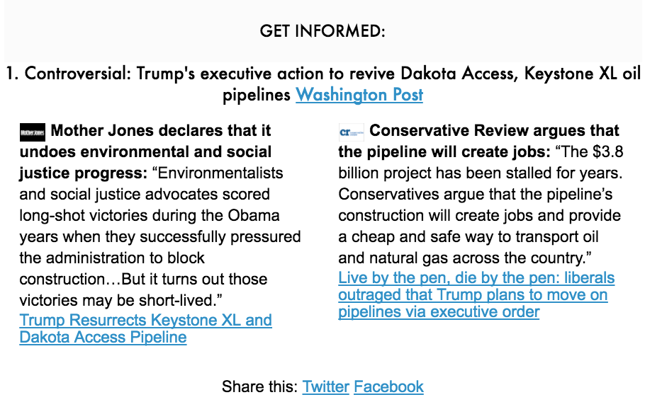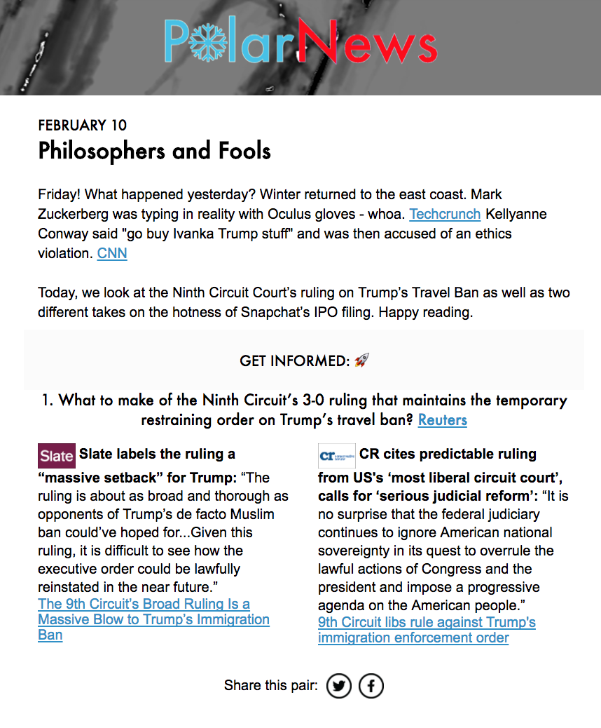 PolarNews is a news reader to break through personal media bubbles. We send a daily email that pairs articles from polarized sources on meaningful topics to let readers to see two sides. Check us out in Technical.ly (http://bit.ly/2kec6Yu), Philly.com (http://bit.ly/2kEPdOv), and the Daily Pennsylvanian (http://bit.ly/2kTBmng). More information is at www.getpolarnews.com and subscriber here: http://eepurl.com/ciW_dD. Onward!