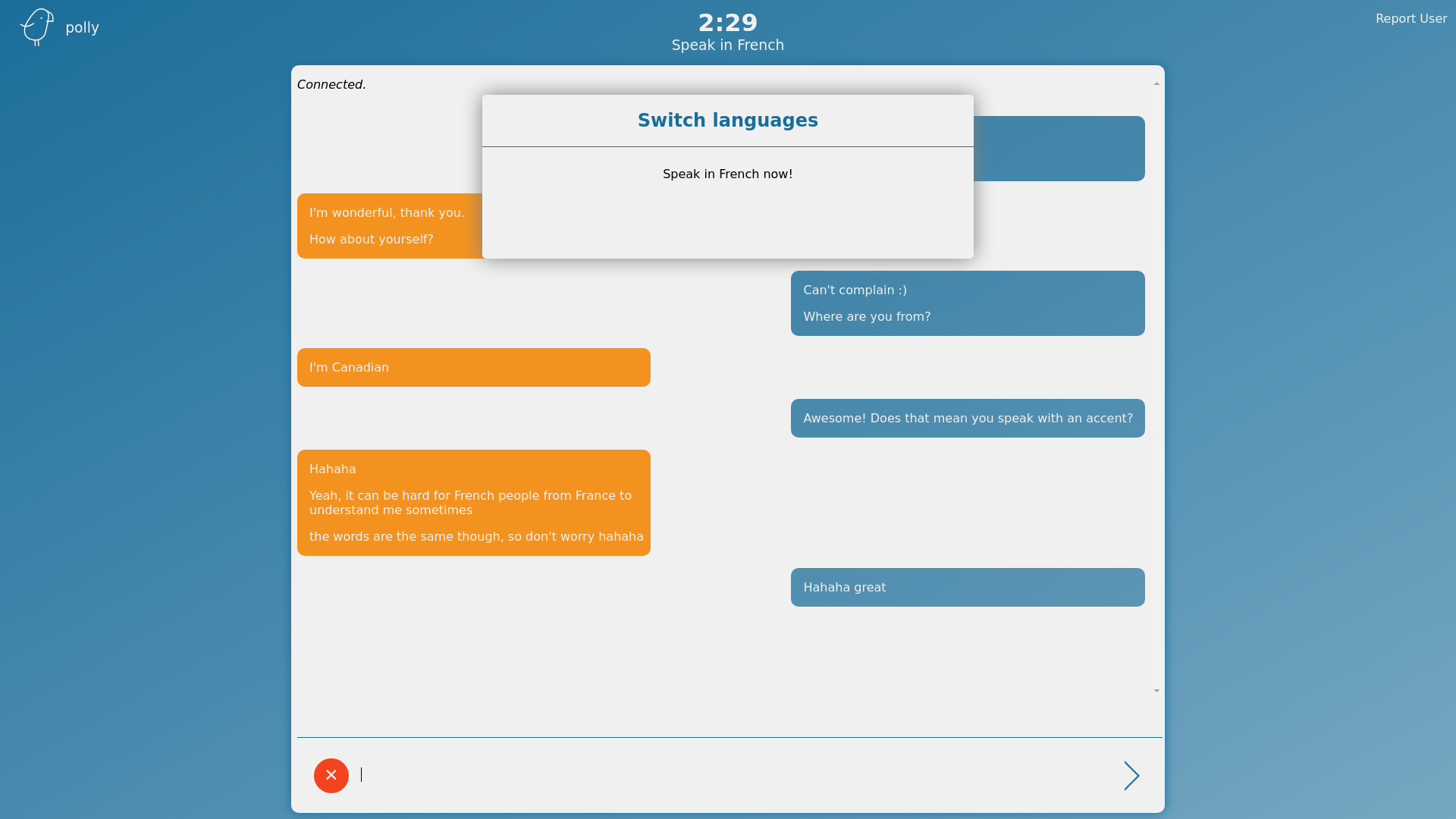 Polly is a web app for supplementing your language learning. I built it because I wanted to practice my French by speaking with francophones. It is simple: you select the language you are learning and the language you want to learn and we match you with someone who speaks the former language and wants to learn the latter! You are put in a chatroom with a timer and a suggestion of which language you should begin by speaking. When the timer is half-finished, you are prompted to switch to the other language. Polly alone is not enough to learn a language, but if you already have some grasp on the vocabulary and grammar of a language it's the best way to internalize what you've learned. At the moment, only random matchmaking is implemented. More sophisticated pairing algorithms, different chat modes, mobile apps, long-term penpals and more are on the development roadmap.
