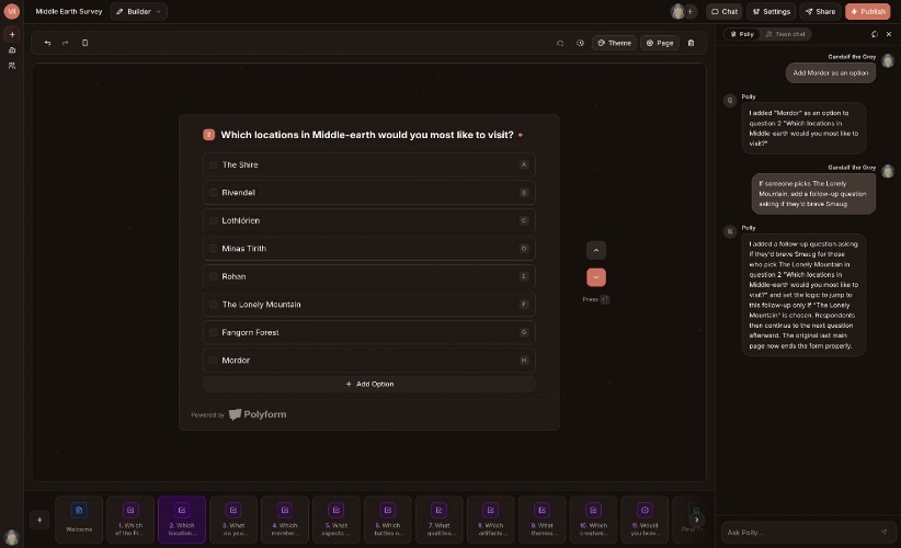 Build beautiful forms in seconds. Polyform is the AI-powered form builder that takes the friction out of creating, managing, and understanding forms. Most form builders force you into rigid templates or leave you staring at a blank page. Polyform starts with a conversation. Tell Polly, your AI form agent, what you need in plain English and get a complete, polished form back in seconds. Polly handles the structure, questions, conditional logic, and even the visual design. Want to tweak the theme, add branching, or restructure the flow? Just ask. Polly stays with your form so you can refine it anytime without starting over. And when you want hands-on control, the no-code drag-and-drop builder gives you full flexibility with over 20 question types, rich text editing, and real-time preview. Every form you create looks intentional. Polyform's theming is built to keep your brand consistent across every device and screen. Add your logo, choose from hundreds of fonts, apply animated backgrounds, or let Polly generate an entire theme from a description of your brand. Your forms stop looking like generic surveys and start feeling like a natural part of your identity. Forms should adapt to people, not the other way around. Conditional logic lets you show or hide questions, branch into different paths, and skip ahead based on responses. Build personalized experiences that only ask what's relevant, all configured visually without code. Polyform was built from day one for teams who don't always sit at a desk. The entire platform is mobile-responsive, not just the forms your respondents see, but the builder itself. Create, edit, and manage forms on any device. True real-time collaboration means your team can work together from anywhere with live presence indicators, instant syncing, built-in team chat with @mention notifications, shared themes, and project organization. Once responses come in, real-time analytics give you the full picture. Track completion rates and trends, see geographic and device breakdowns, and follow individual response journeys to understand exactly where people engage or drop off. Export to Excel or CSV, connect through the API, or set up webhooks for instant notifications. From first idea to final insight, Polyform gives you everything you need to build forms that are beautiful, intelligent, and truly yours. No busywork. No compromise.