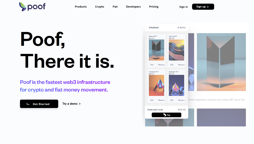 Poof Payments enables digital businesses to easily and cheaply accept fiat and cryptocurrency payment options. Businesses can accept +50 payment options via one-click and accept payments through a free digital storefront, easy to integrate checkout, or our robust API. Here are a few integration options users have on Poof: Payment Gateways: Venmo, PayPal, Stripe, Cash App Credit Cards: Mastercard, Visa, American Express, and Discover Web3 Payments: Polygon, Avalanche, Near, Ethereum, and Moonbeam Digital Currencies: Litecoin, Bitcoin, XRP, Dogecoin, Solana Poof Payments is the best way to accept payments online. It’s fast, secure, and customizable to suit your needs. Get started today by signing up for an account at poof.io