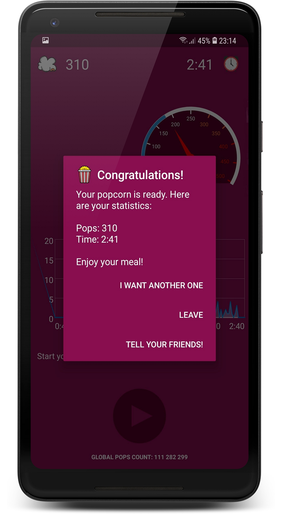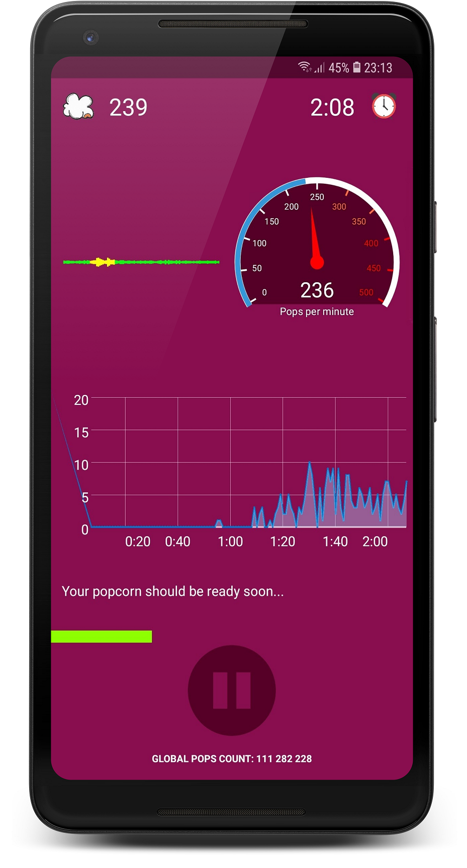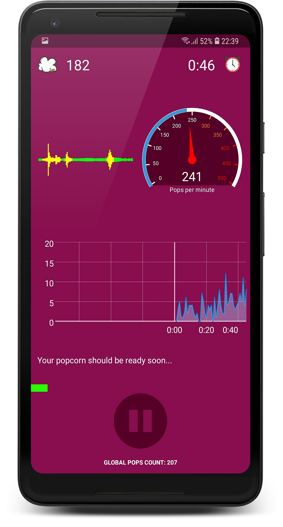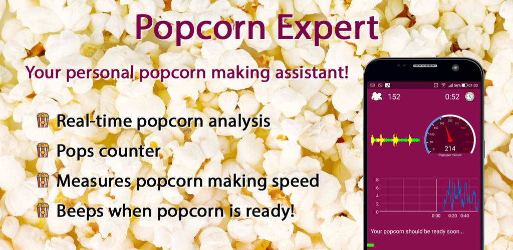 Popcorn Expert uses TensorFlow machine learning engine to analyze popcorn making sounds ("pops"). Start your microwave and run the app - Popcorn Expert will recognize and count pops, and alert when it is the best time to stop the microwave. Includes extra features like soundwave visualization, pops per minute speed gauge and Global Pops Counter!
