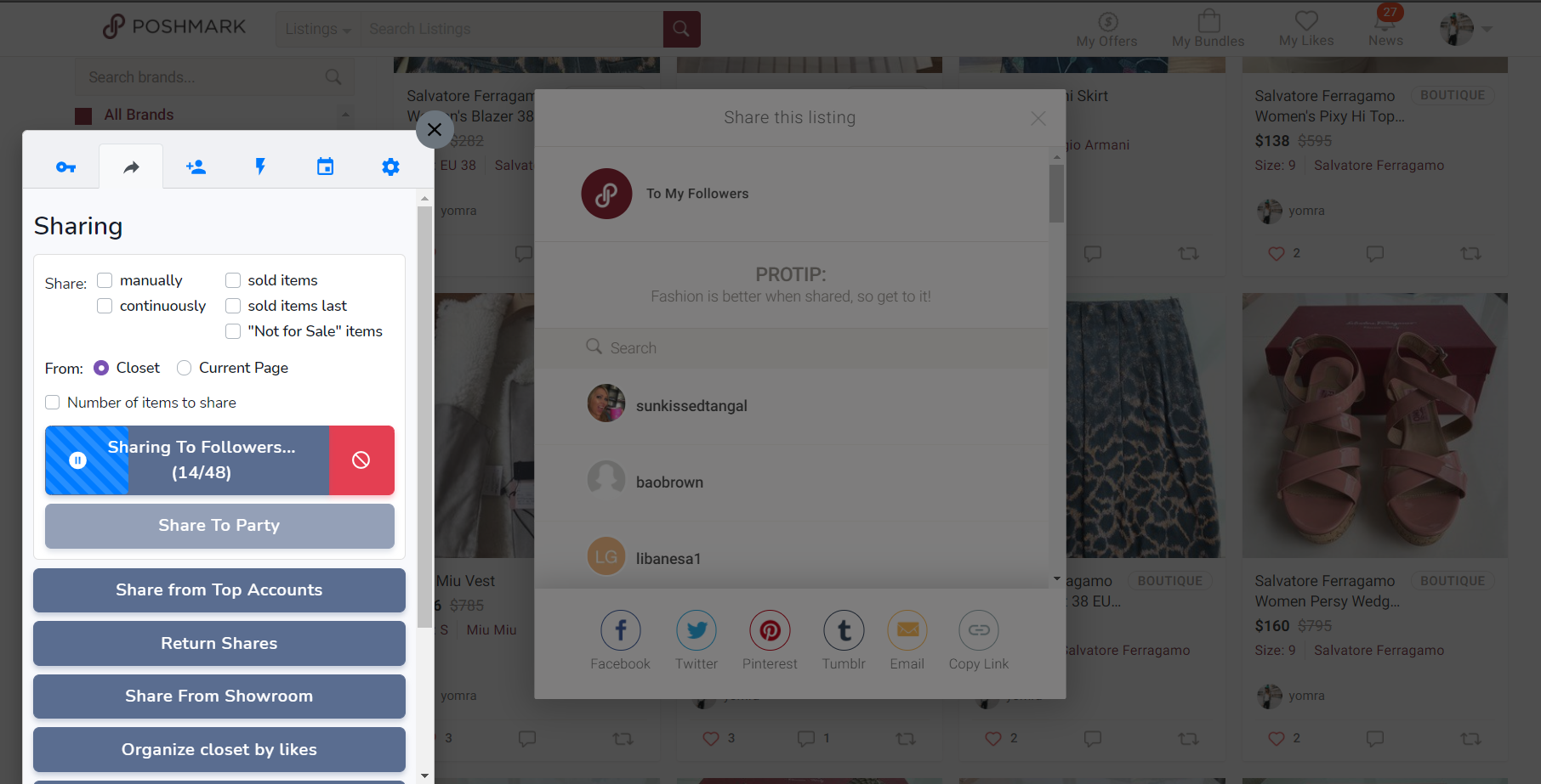 We are proud to be the only bot that combines automation with rich Poshmark data. Compared to other bots, we specialize in getting your listings in front of many buyers. PoshMarvel will get you more followers in a week than you could ever do in a month. Run our sharing tools for a week, see it for yourself. Are you tired of sharing all day long to get sales? Instead of manually sharing every single listing, PoshMarvel will help you share your closet all at once, saving you valuable time to do things you love! Stop wasting your valuable time doing the tedious tasks of sharing and following. Are you using a virtual assistant? Hiring a VA to share your closet is expensive, costs more than $100 per month not to mention the security breach risks. Unlike a VA, PoshMarvel runs from a browser. We never ask your Poshmark password. Save hundreds by firing your virtual assistant who is most likely using a bot anyways! Try PoshMarvel for free and see how much more effective it is than working with a VA.